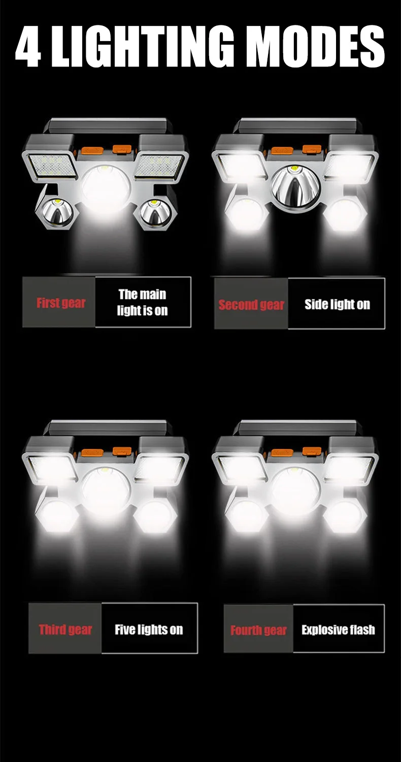 *3. 4 lighting modes available, ON/Main light/Side light/Strobe, the rechargeable 1200mAh battery works long each charge.