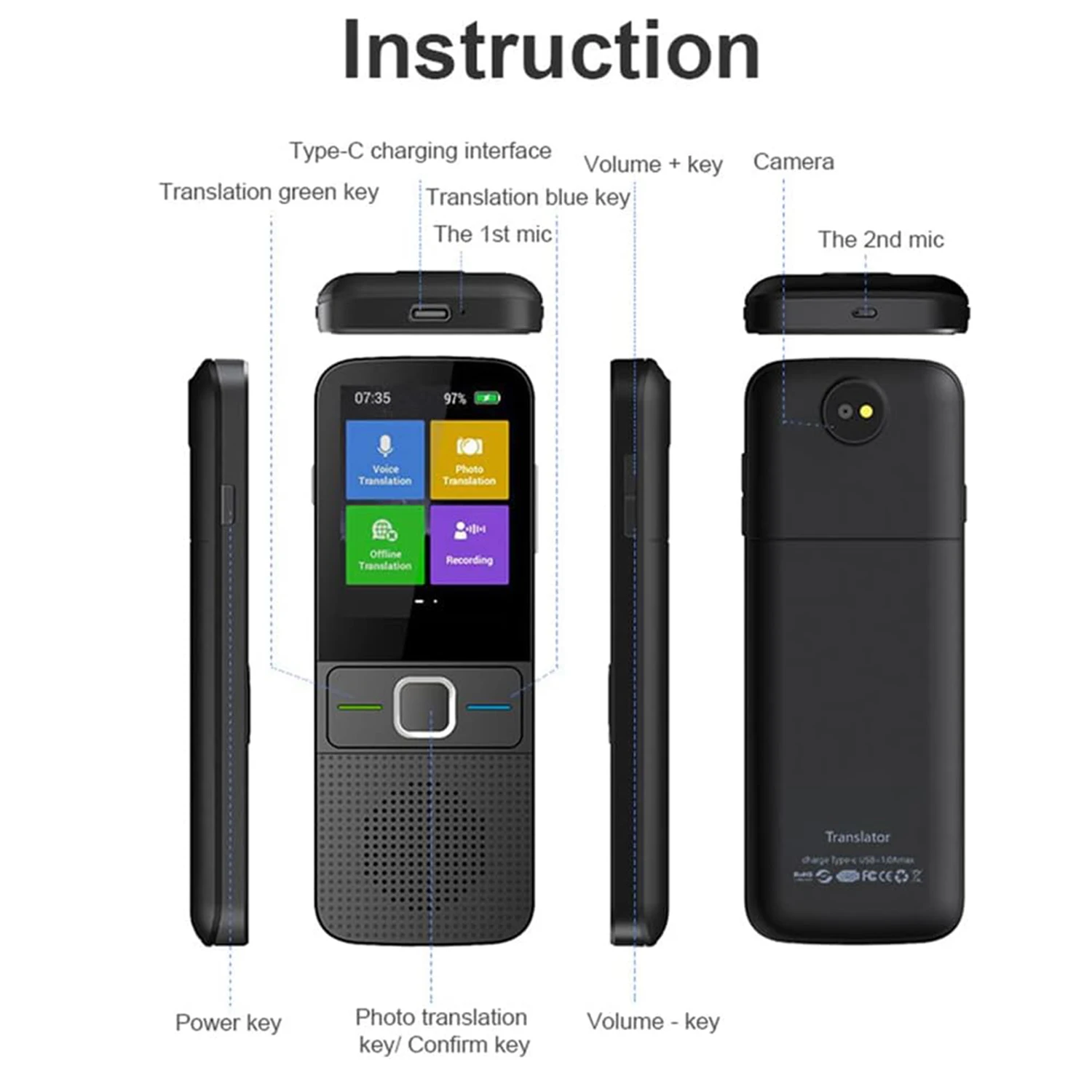 Image Translation: The translation function can be realized by taking pictures, save time, support 36 kinds of voice transmission, and will add more languages in the future.