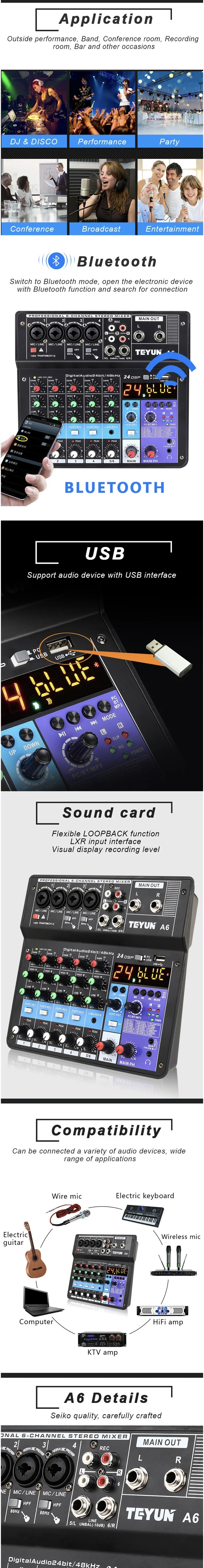 Product descriptionThe mixer is a multi-purpose 4-channel mixer with a sound card that can be meet users of home music production, webcast, K song and other needs.FeaturesThe mixer is equipped with input gain and high bass adjustment, built-in 48V phantom power supply for condenser microphone direct power supply, high-definition headset output port, MP3 broadcast, device with a sound card can be directly connected to the PC.Mixer compact, lightweight, can be directly connected to the PC’s USB port power supply,No additional power, can be connected to the computer through the USB power supply to run, eliminating the need forWith the trouble with an external adapter, you can also use the mobile power or USB AC / DC.The adapter is powered by the adapter.