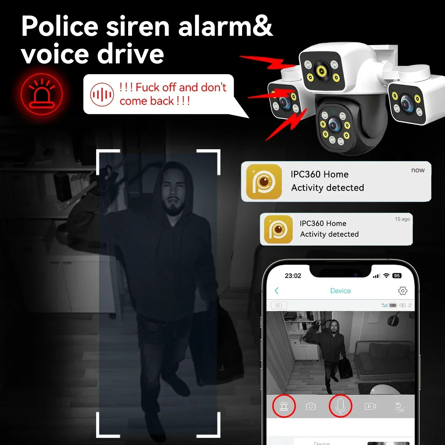 ✅ Deter intruders – Siren, flash, and voice warnings in 8 languages.