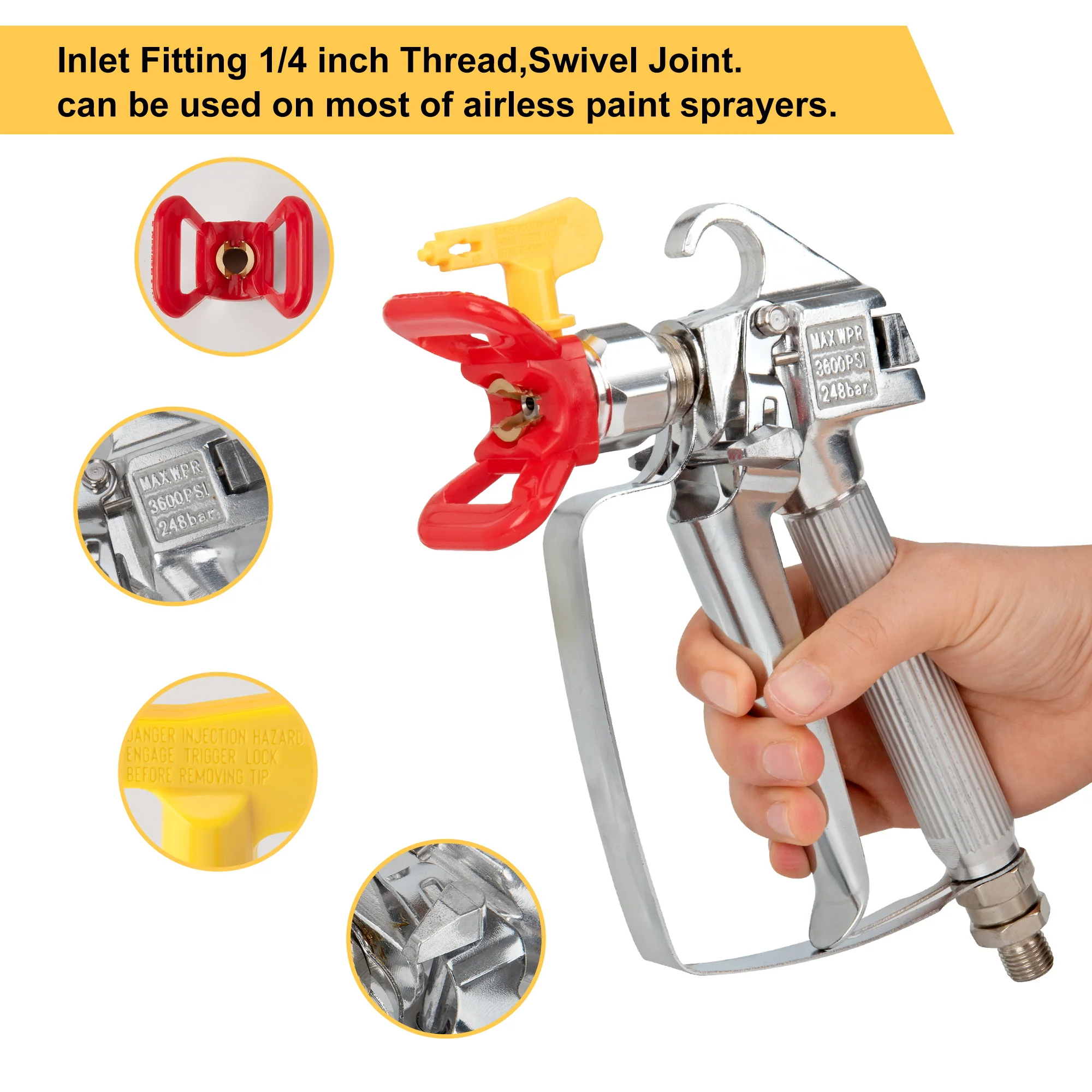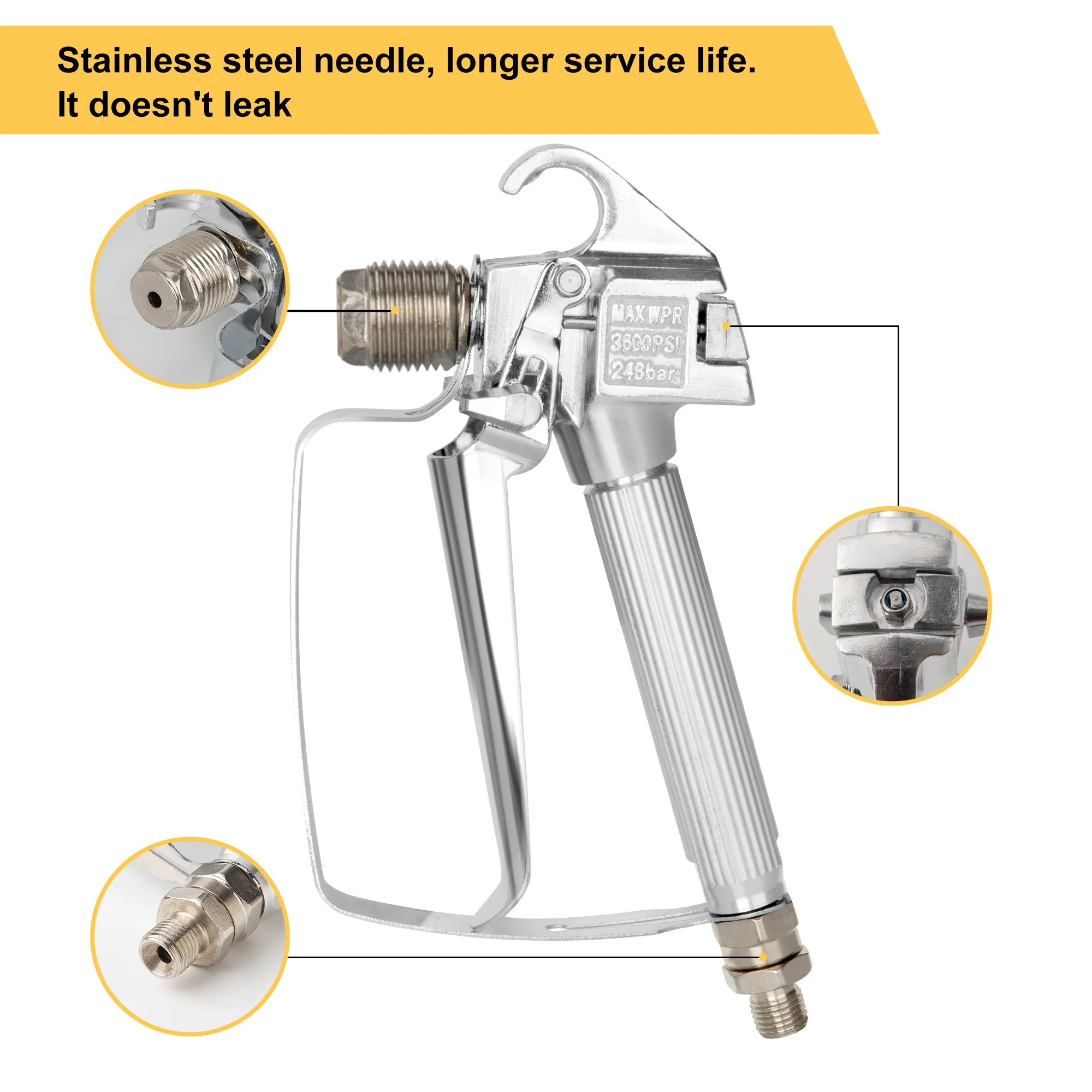 A lock is used to fix the handle and avoid accidental spraying paint. Besides, the 4-finger ergonomic trigger is designed to reduce fatigue. Smooth, lightweight, and durable control offers a comfortable experience.