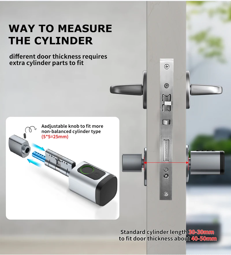 Adjustable length cylinder lock, 99% of world doors to compliance; easy replacement of existing lock cylinder.