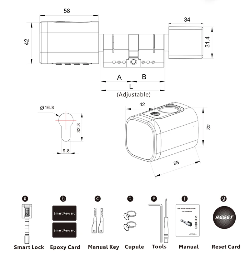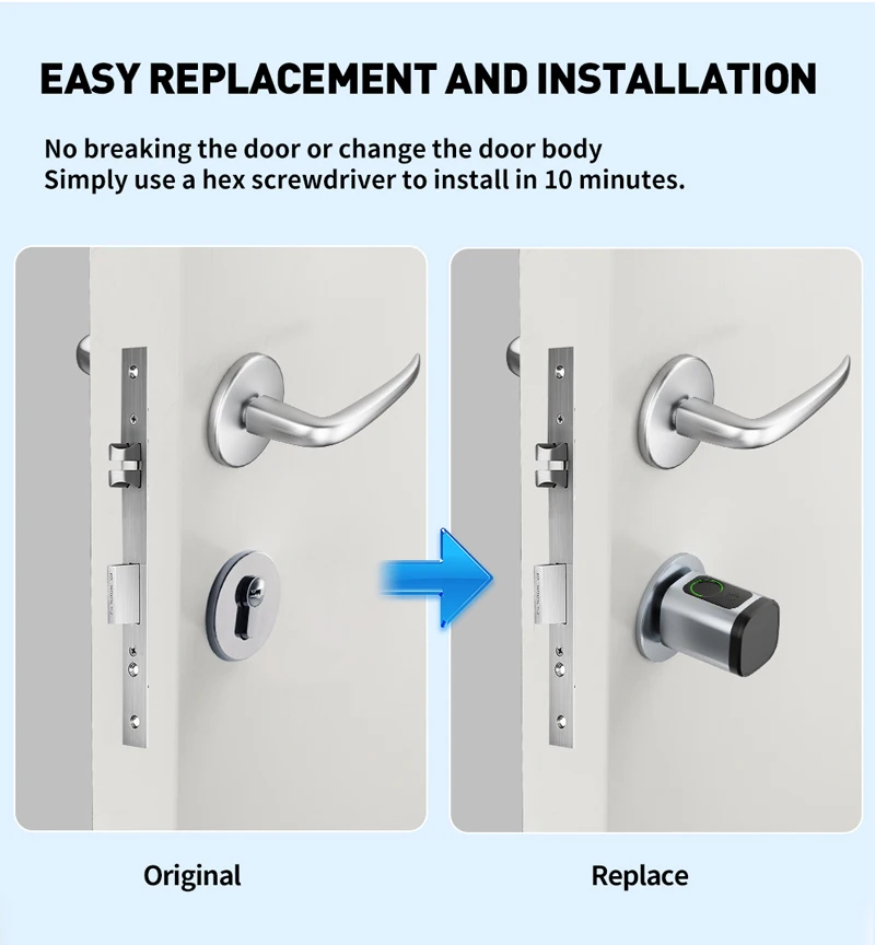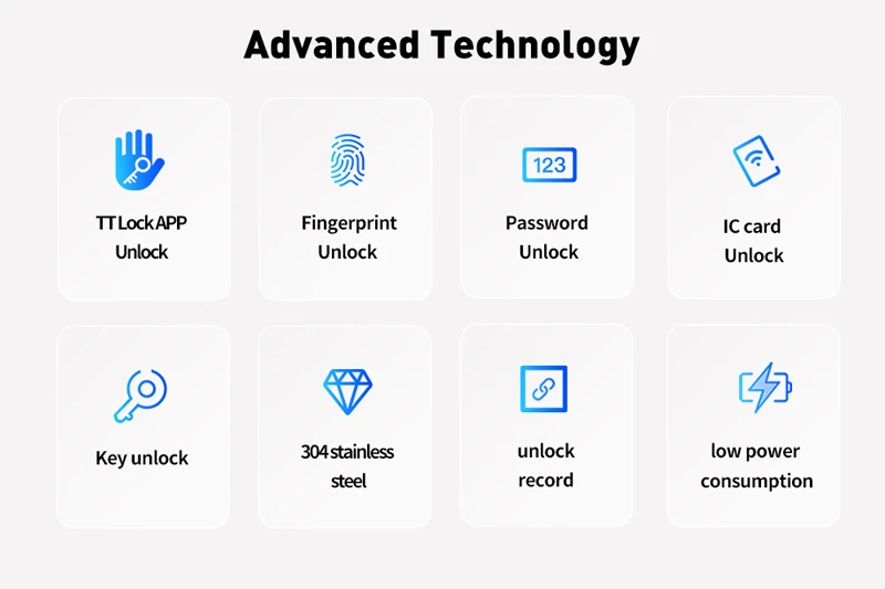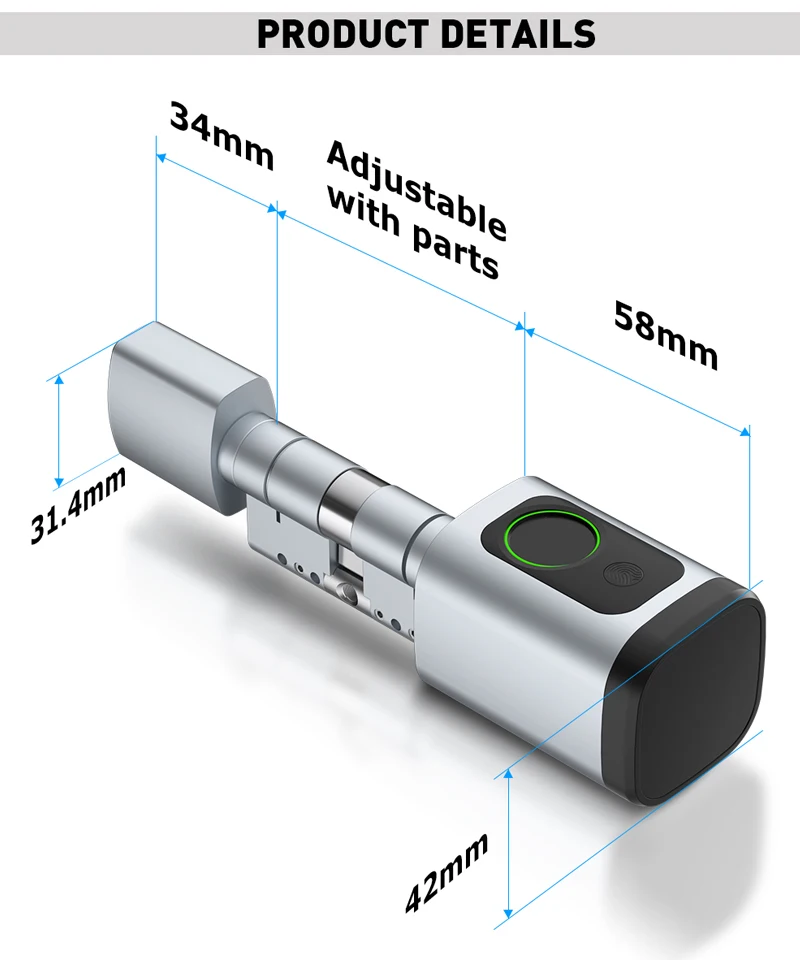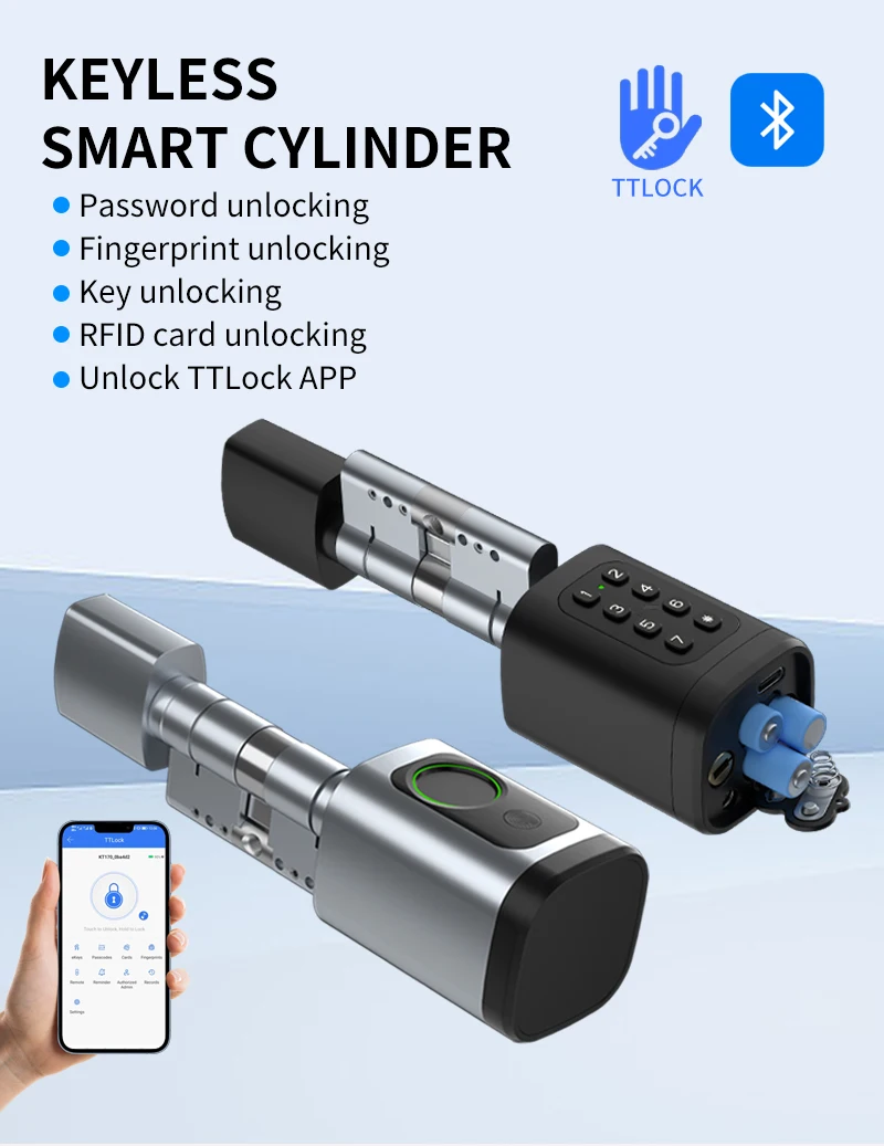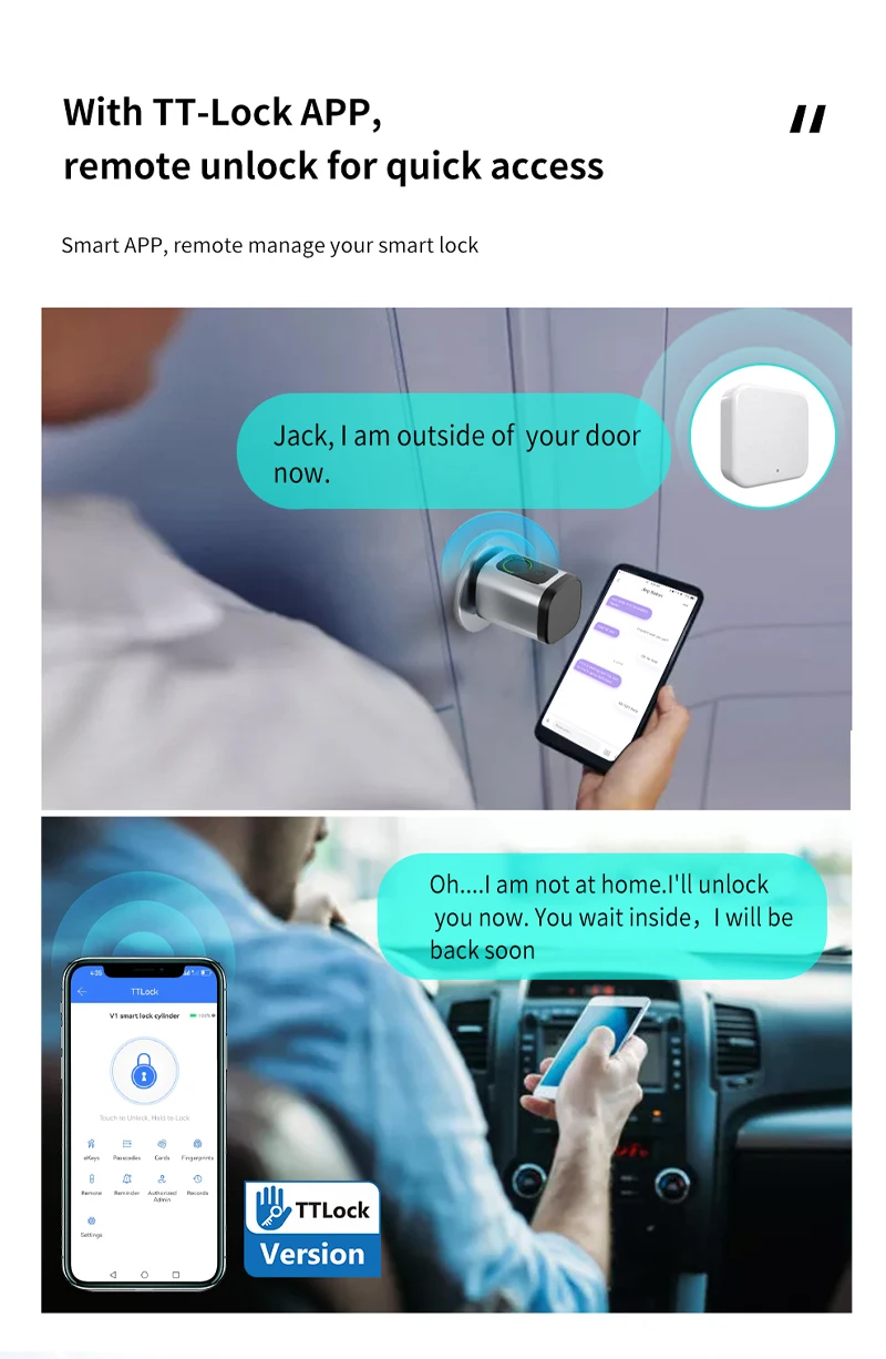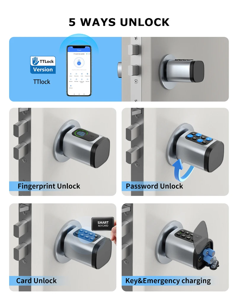 TTlock App, fingerprint, NFC,card, mechanical key,pincode password unlock; easy to use it whether children or older. Keyless:Never worry forget to bring the key.