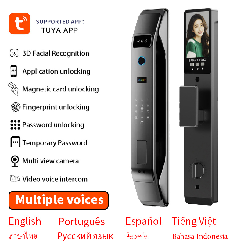 Product features: 3D Face Unlock + fingerprint + magnetic card + password + key + video peep hole + remote capture unlock + unlock record + doorbell + automatic switch lock
