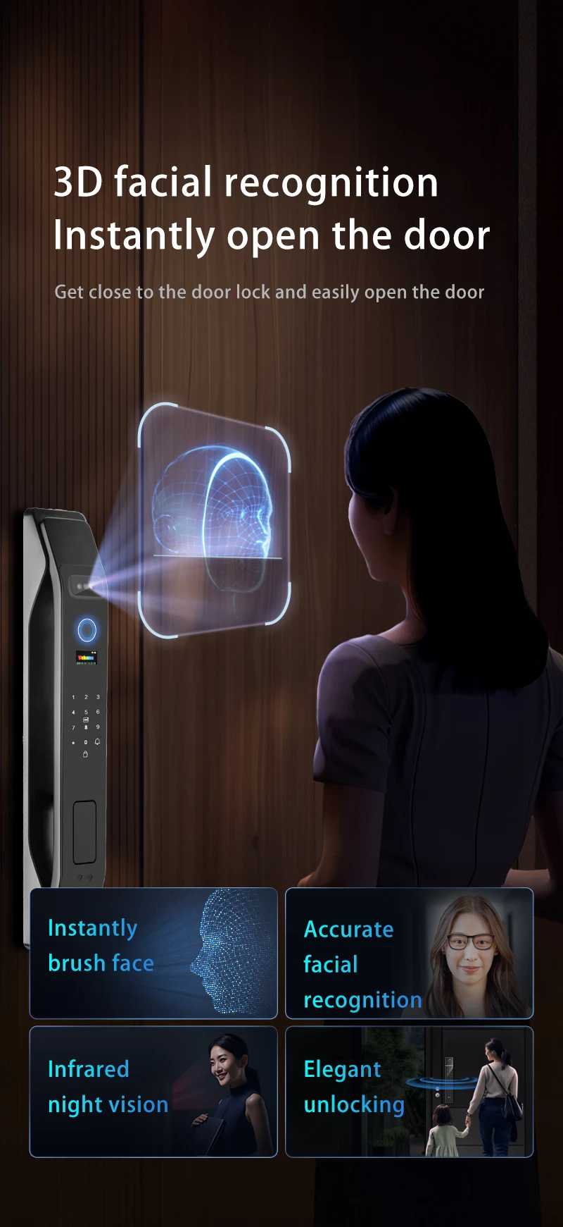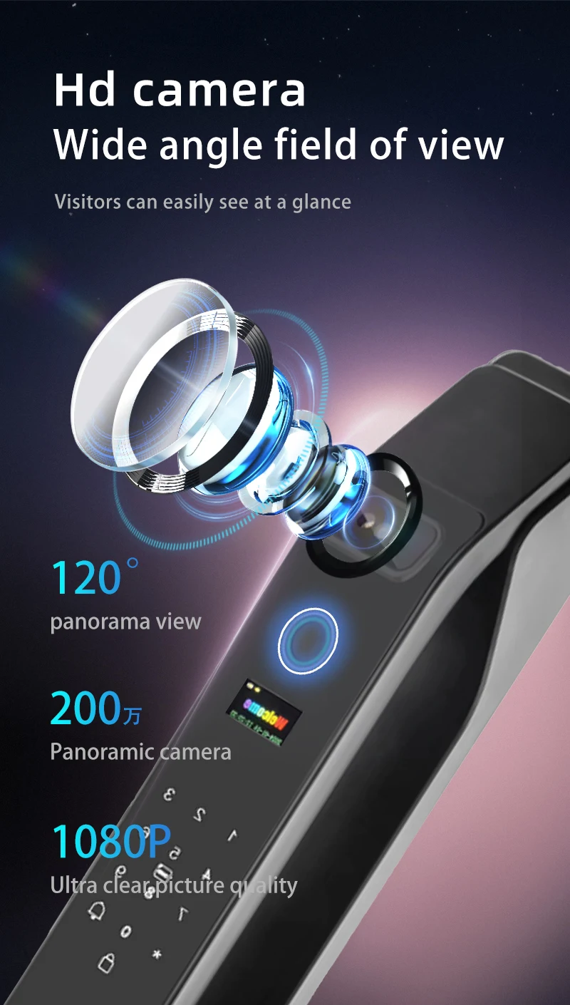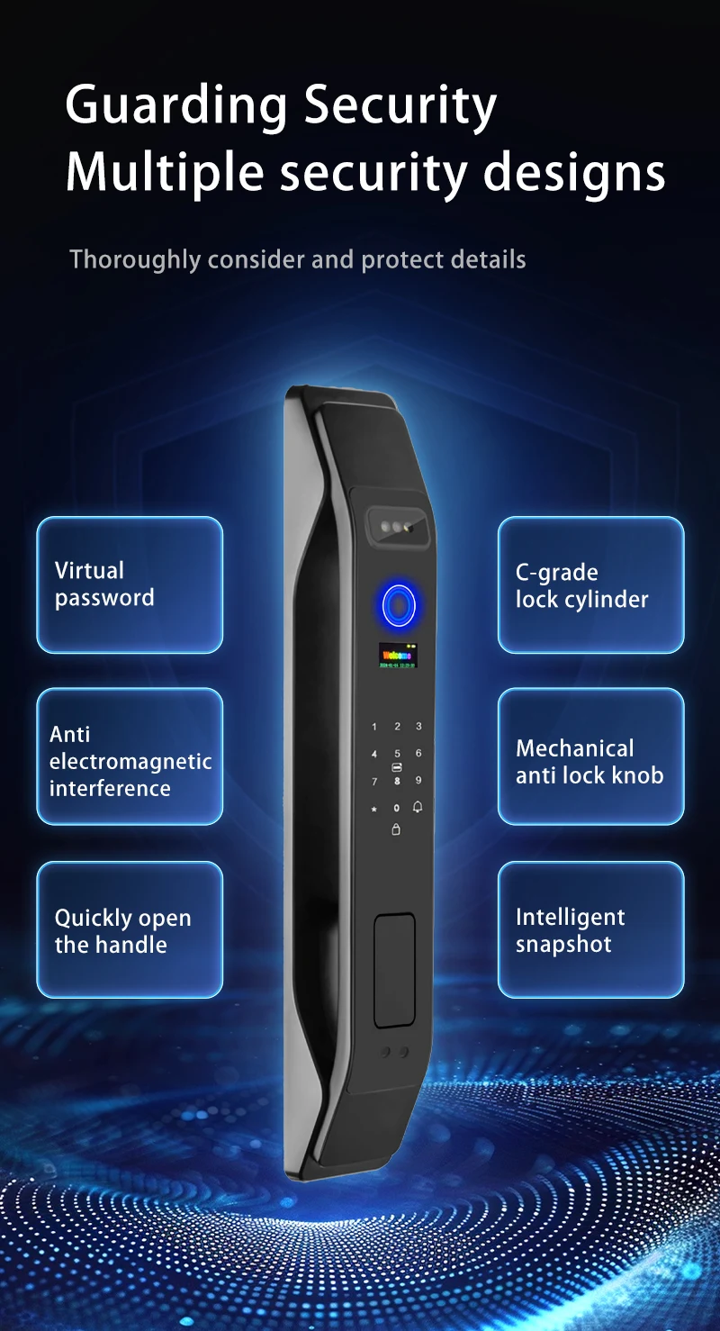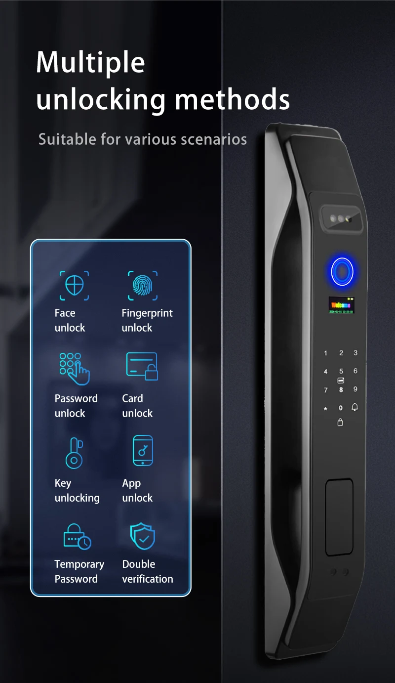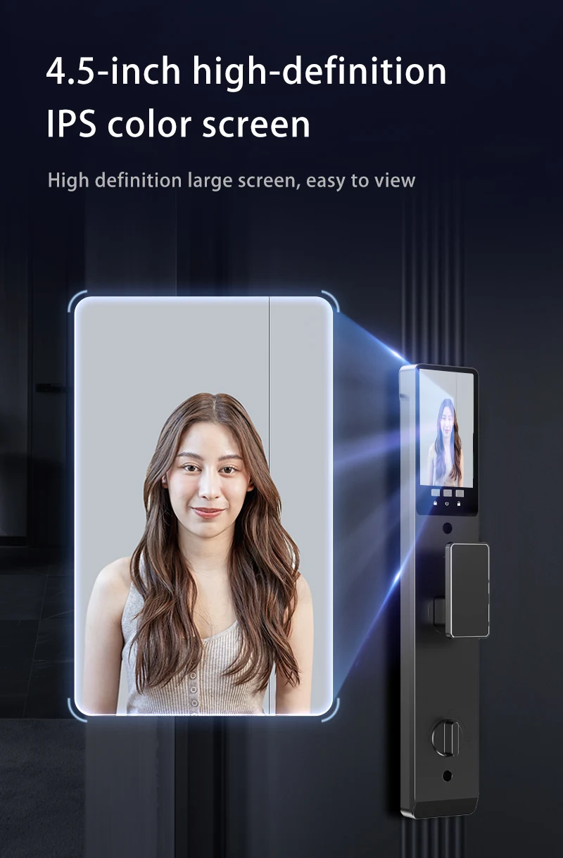 Product features: 3D Face Unlock + fingerprint + magnetic card + password + key + video peep hole + remote capture unlock + unlock record + doorbell + automatic switch lock