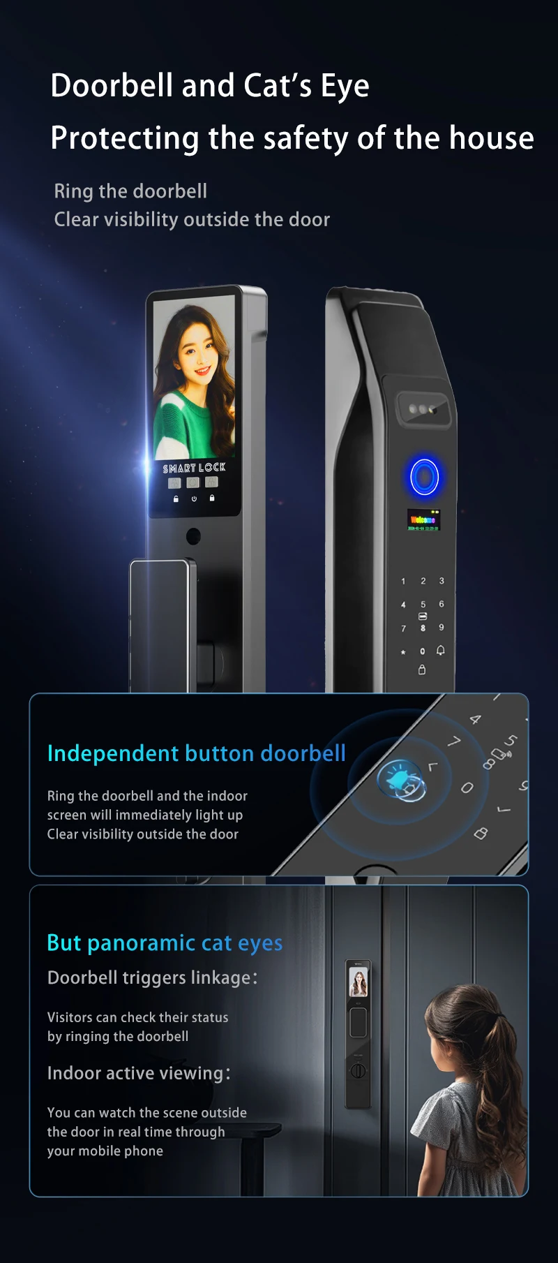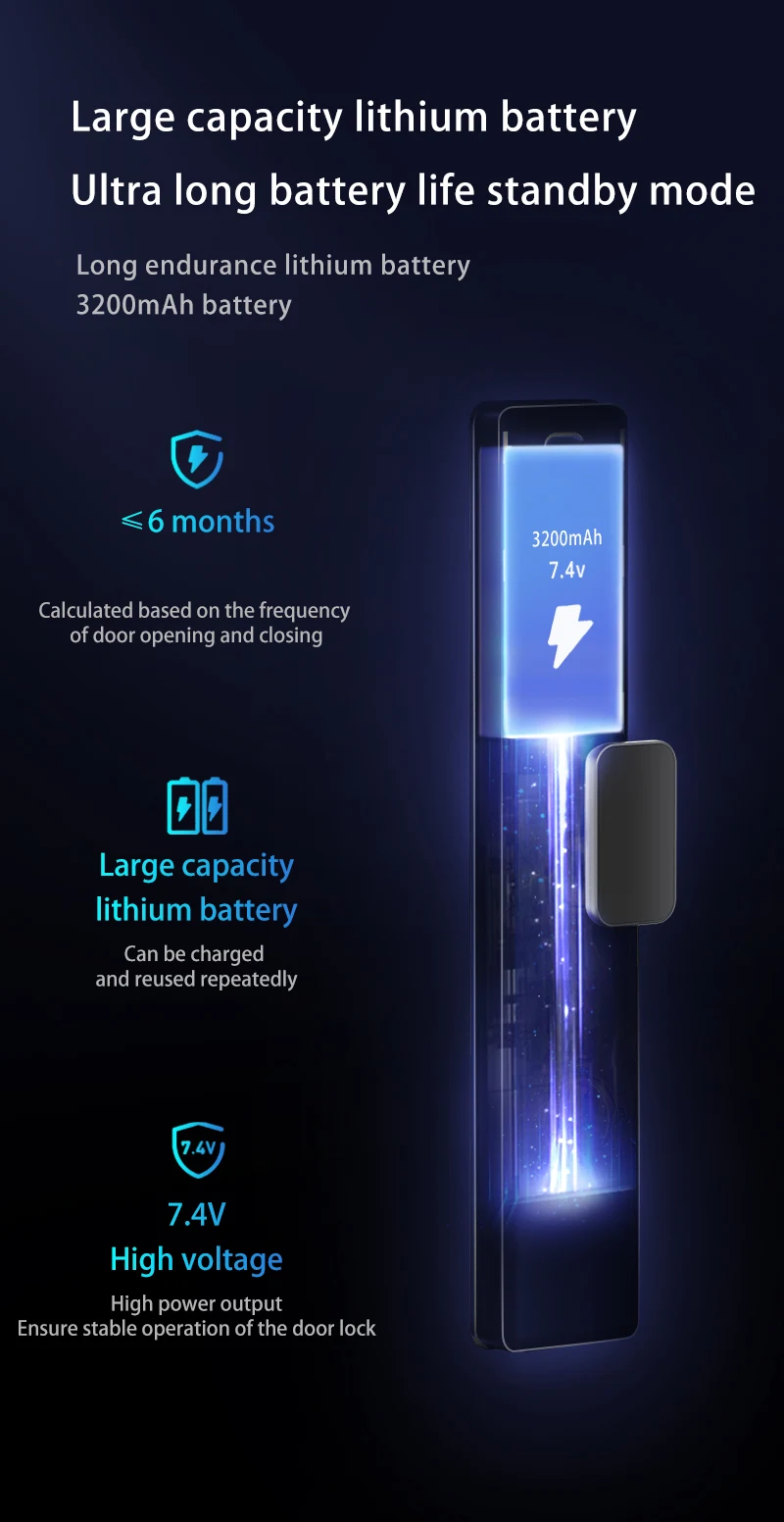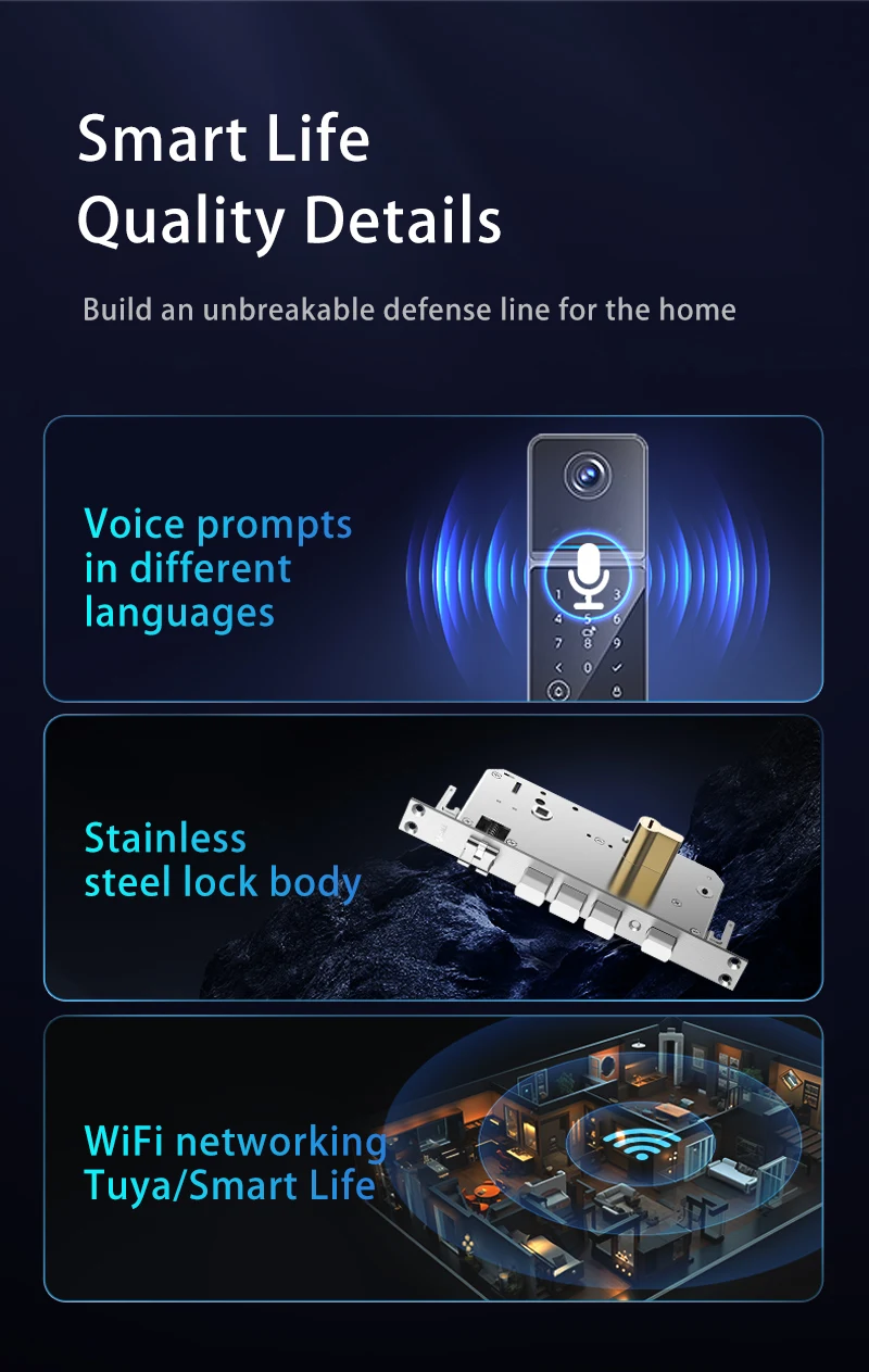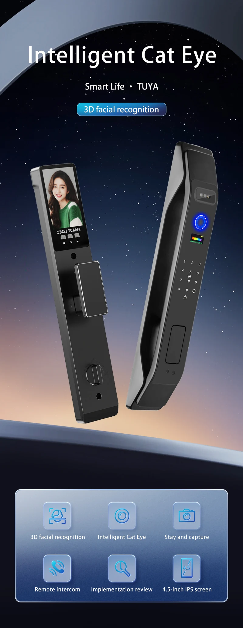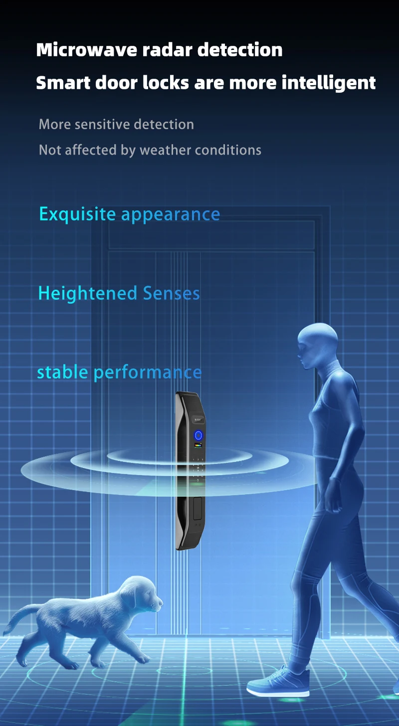 Product features: 3D Face Unlock + fingerprint + magnetic card + password + key + video peep hole + remote capture unlock + unlock record + doorbell + automatic switch lock