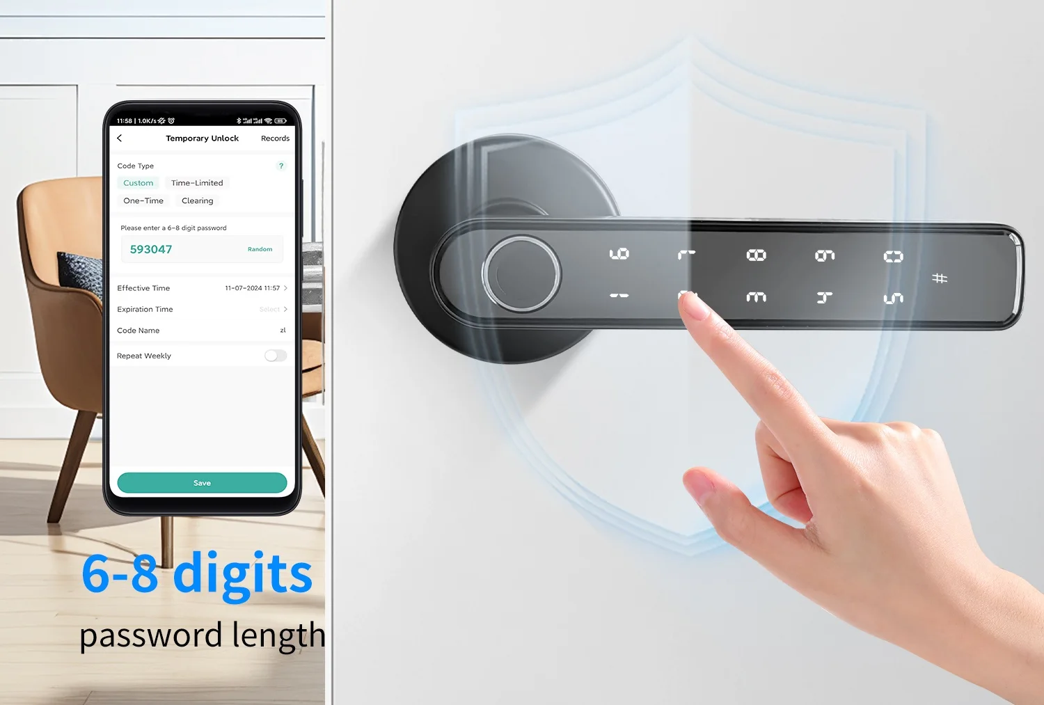 Features 100M+ password combinations with 6-8 digit length. Secure, keyless entry via touchpad. Durable, weatherproof design. Easy installation, compatible with most doors. Anti-peep & anti-tamper tech.