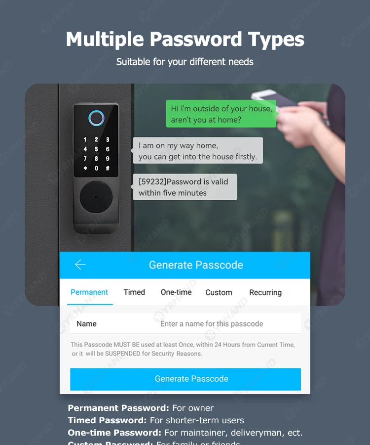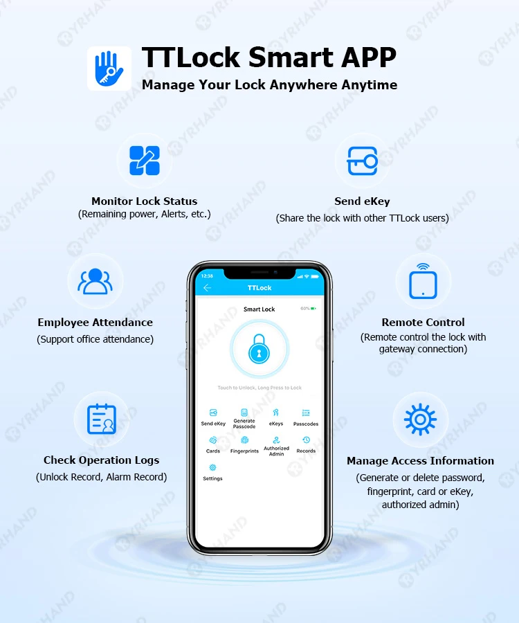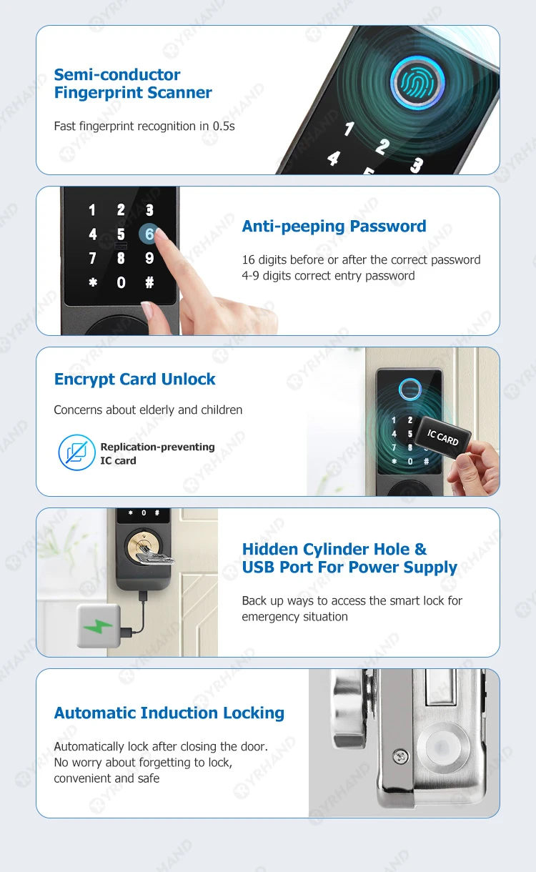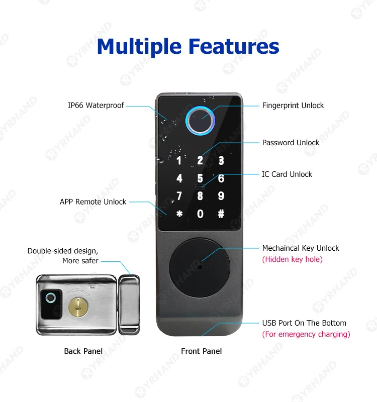 3.Advanced Fingerprint, IC card, Passcode, APP control, Mechanical Key;