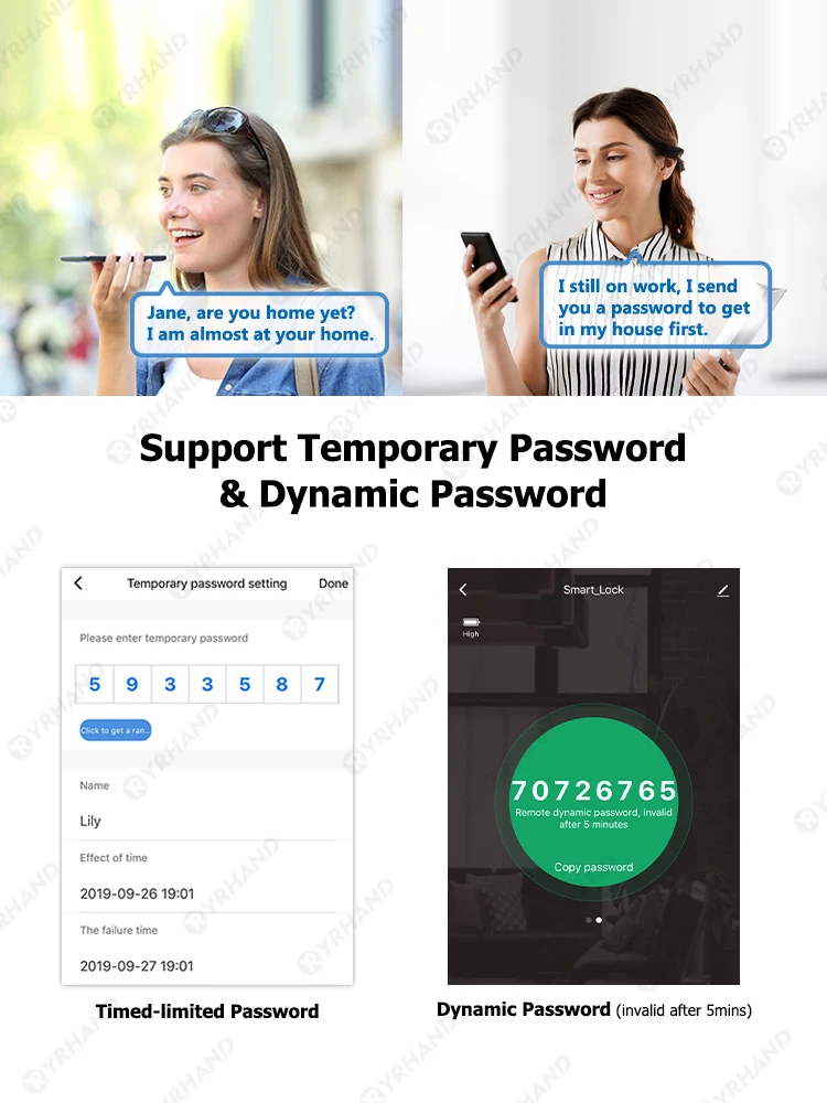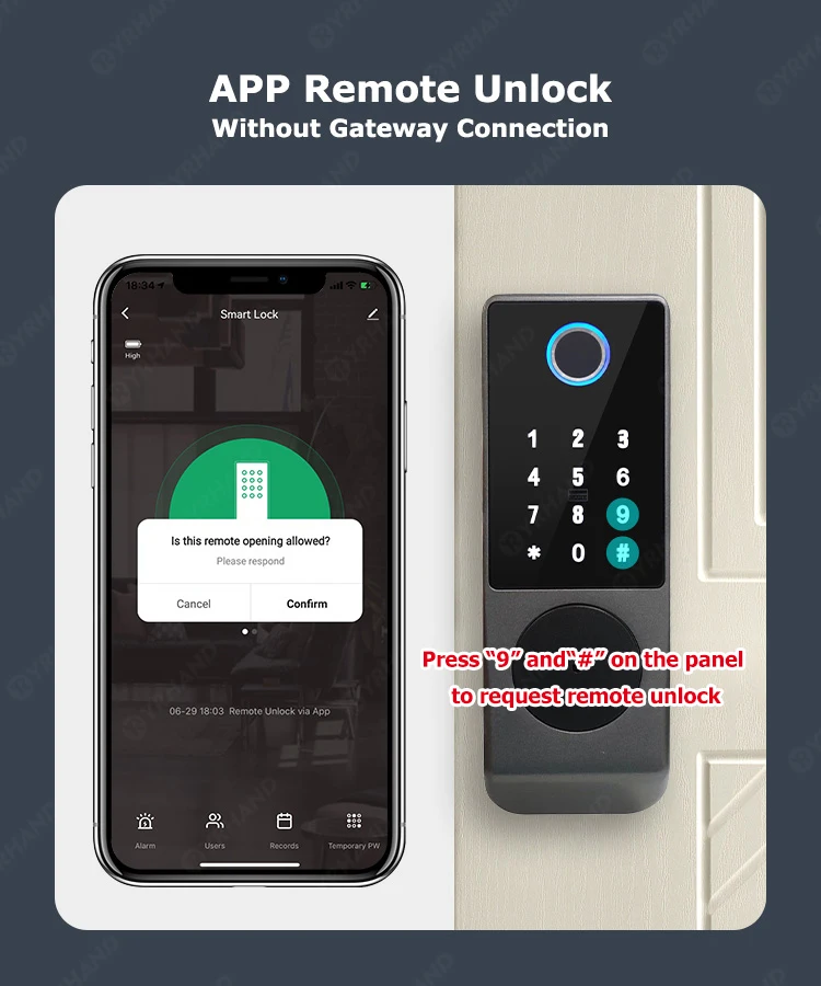 4.Remotely control your door locks, view unlock messages and send temporary passwords, etc, no need add gateway.
