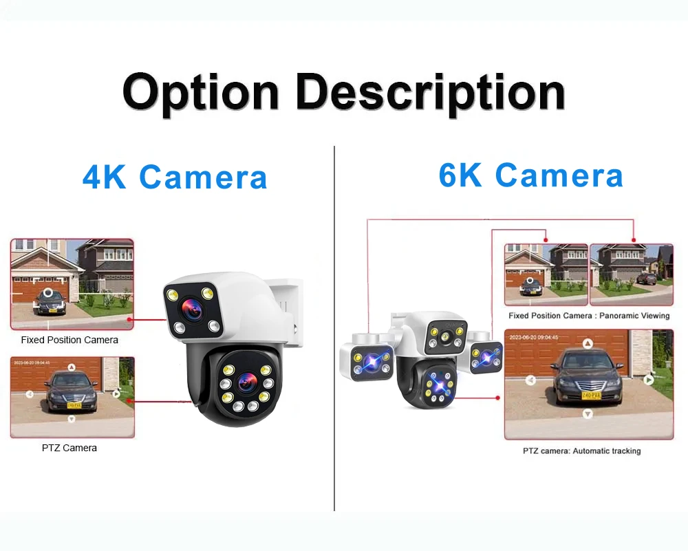 -6K resolutions for your choice. Uhd graphics bring you a higher definition visual experience, AI functions: support motion detection, humanoid tracking, alarm voice prompt and flash, drawing alarm alarm, humanoid frame.