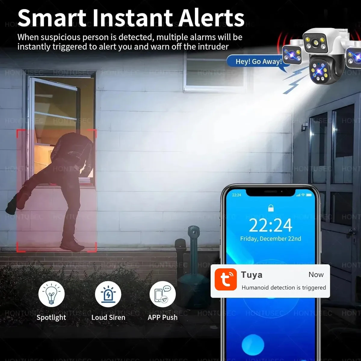 * When suspicious person is detected, multiple alarms will be instantly triggered to alert you and warn off the intruder.