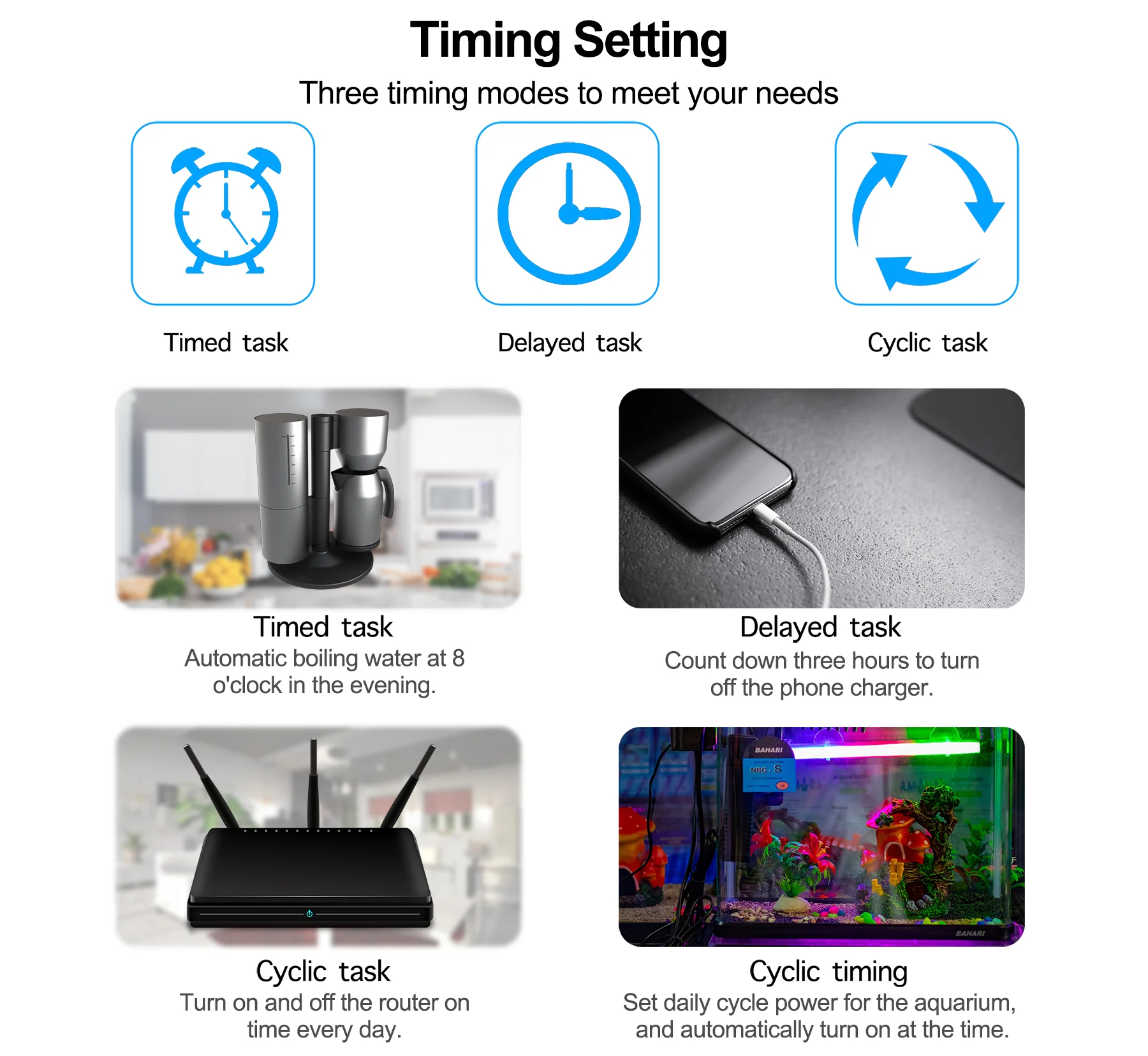 – Simply set a timer for your rice cooker or juicer, so when you wake up in the morning, all is ready, low power consumption for Electricity saving