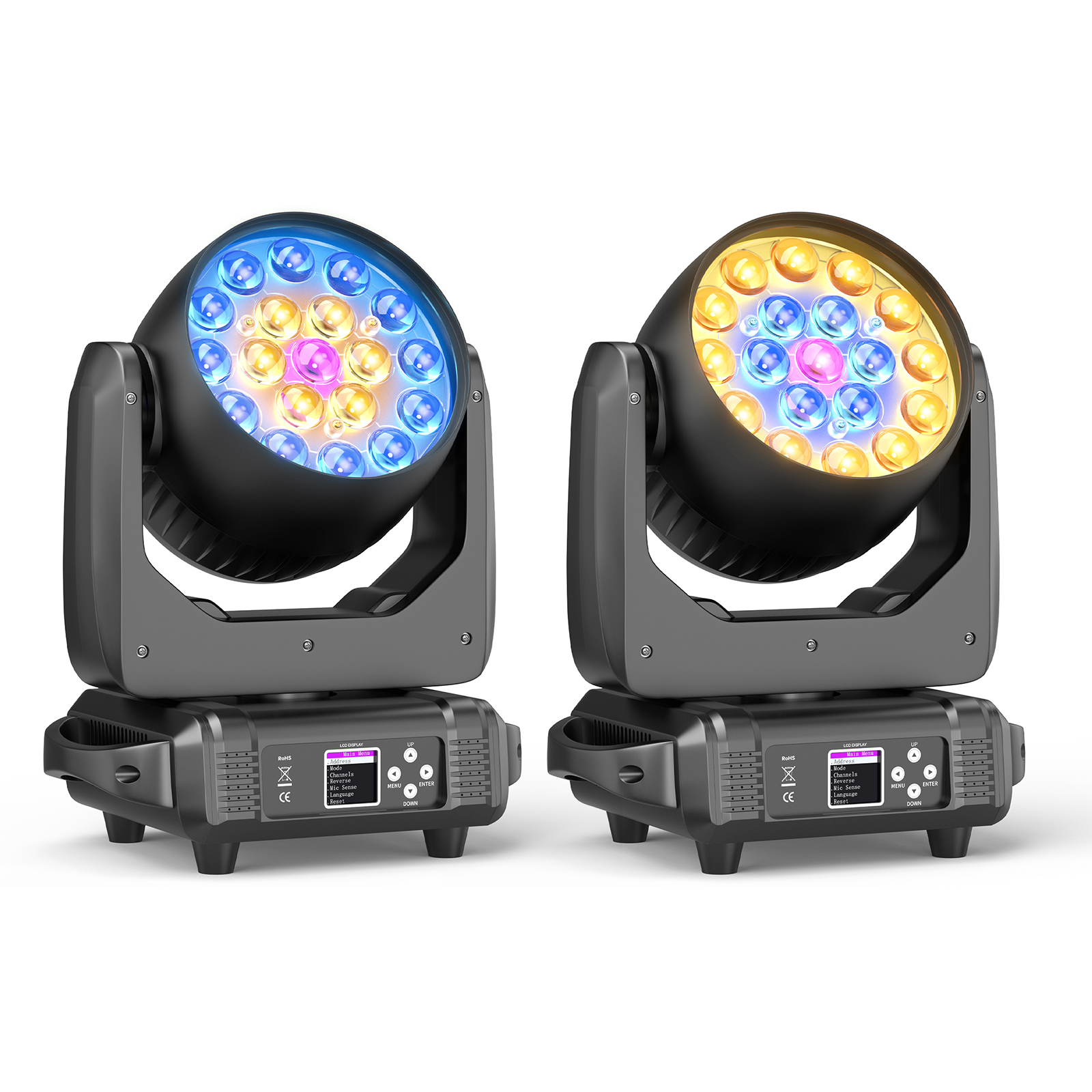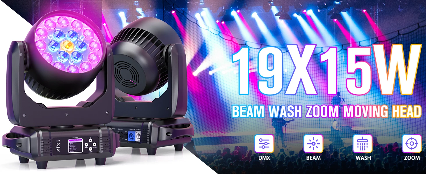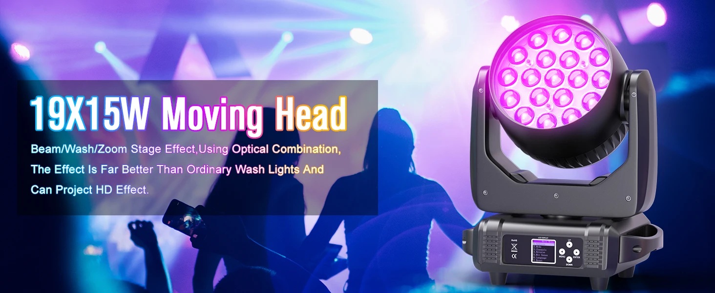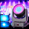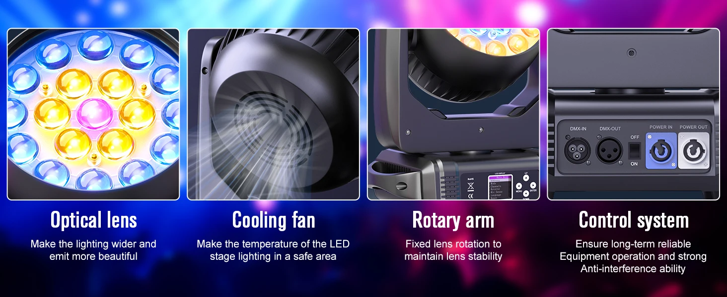 3. Rocking Head Function: The focusing and dyeing rocking head is equipped with a rocking head function, which can realize horizontal and vertical rotation and scanning motion. Through the console or automatic program, you can set the range and speed of the fixture’s panning head movement, allowing the lights to scan and display flexibly on the stage or venue.