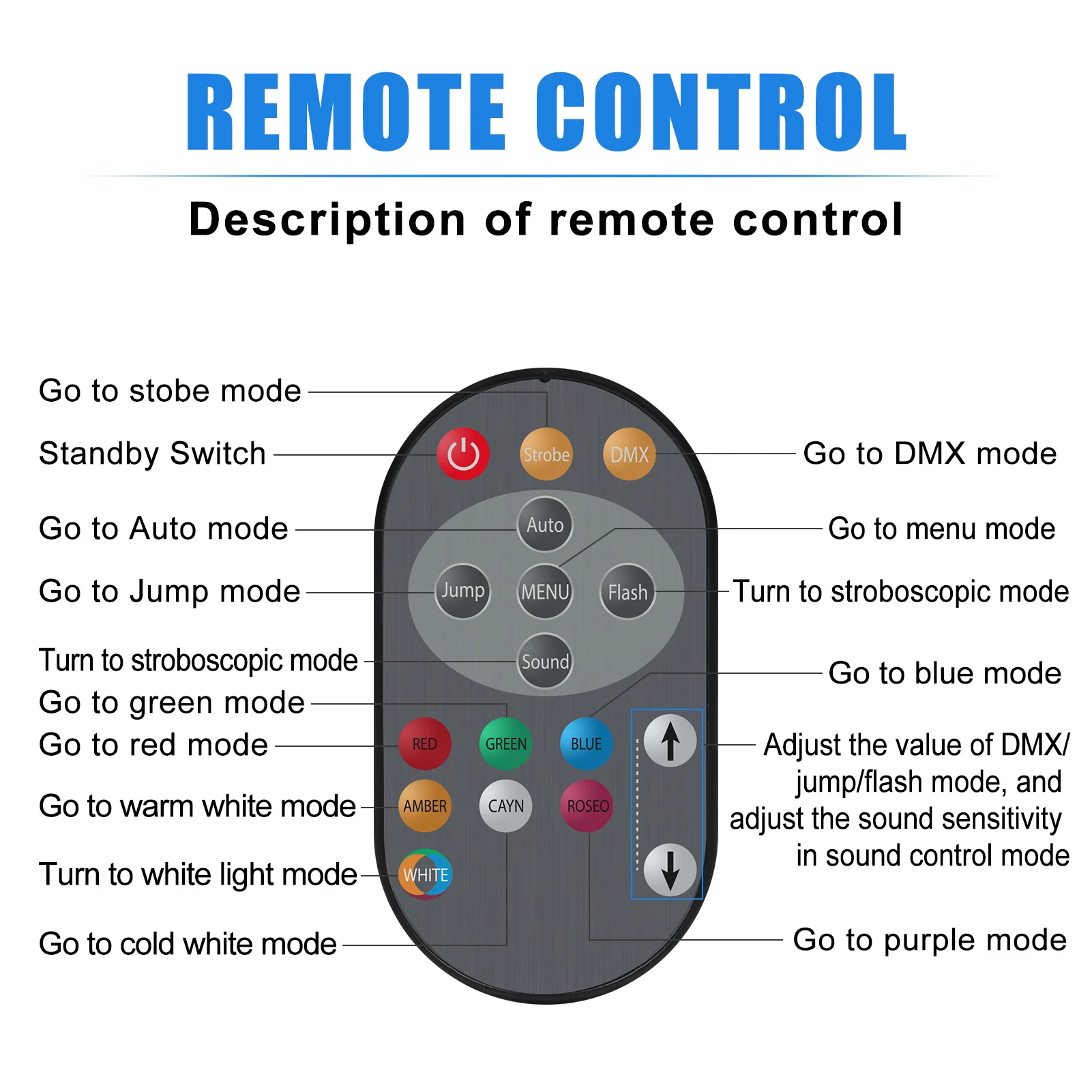 1. 7pcs 6W RGBW 4-in-1 light source to create infinite color mixing and rainbow effect, the built-in program can be controlled through the console, 0-100% linear dimming and light blocking function.
