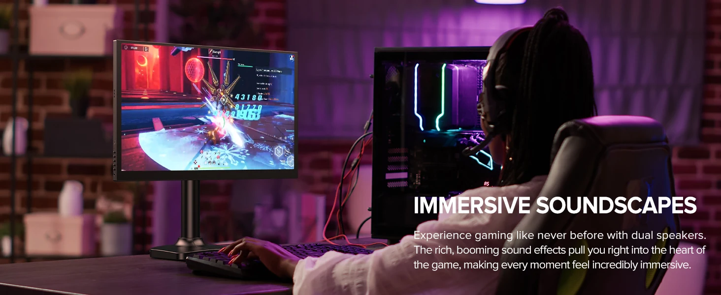 [Shocking Audio-visual Feast] The built-in speaker (8Ω 1W) provides a stereo sound source, and the 3.5mm headphone jack outputs a 3D stereo surround sound source, bringing an immersive sound source experience, as if you are in a theater. UPERFECT low blue light technology reduces the damage of blue light to the eyes, even when watching games, videos, etc. Even watch for a long time, it will not cause damage to the eyes. 4K 18 inch large gaming monitor brings users a refreshing and immersive gaming visual experience.