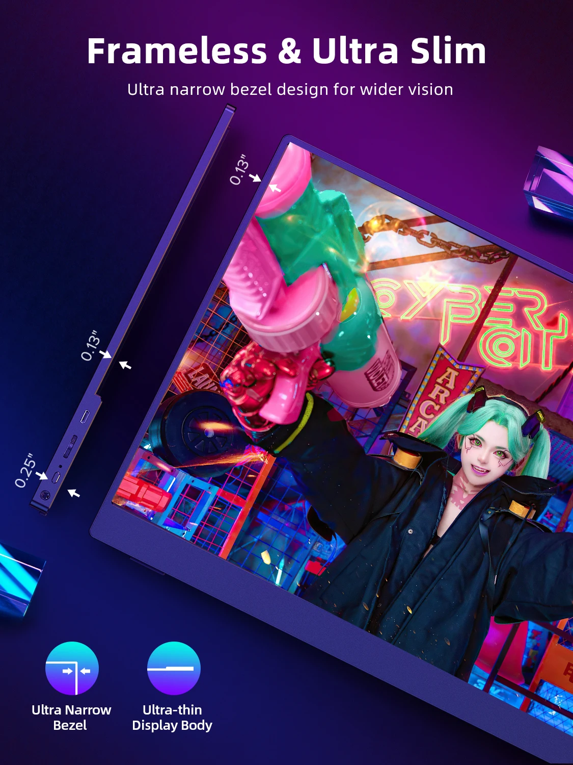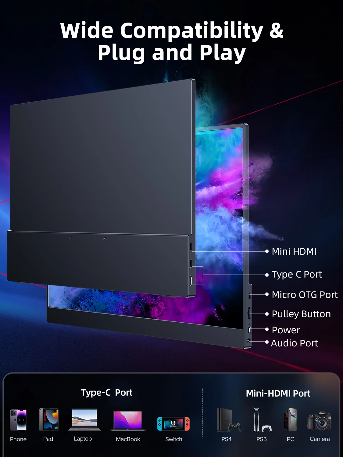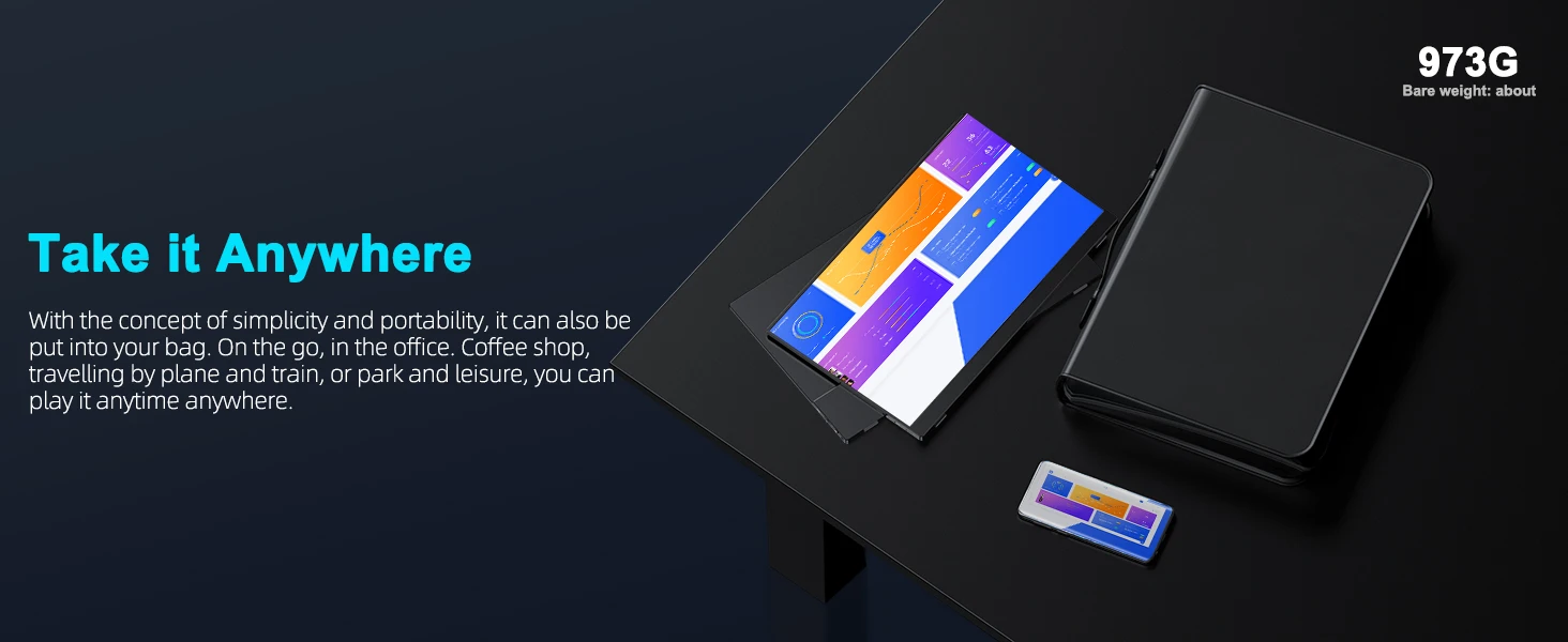 The 17.3″ 2K portable monitor has no built-in battery, without touchscreen function,you can’t charge it.you cant touch it, just connect and get started.