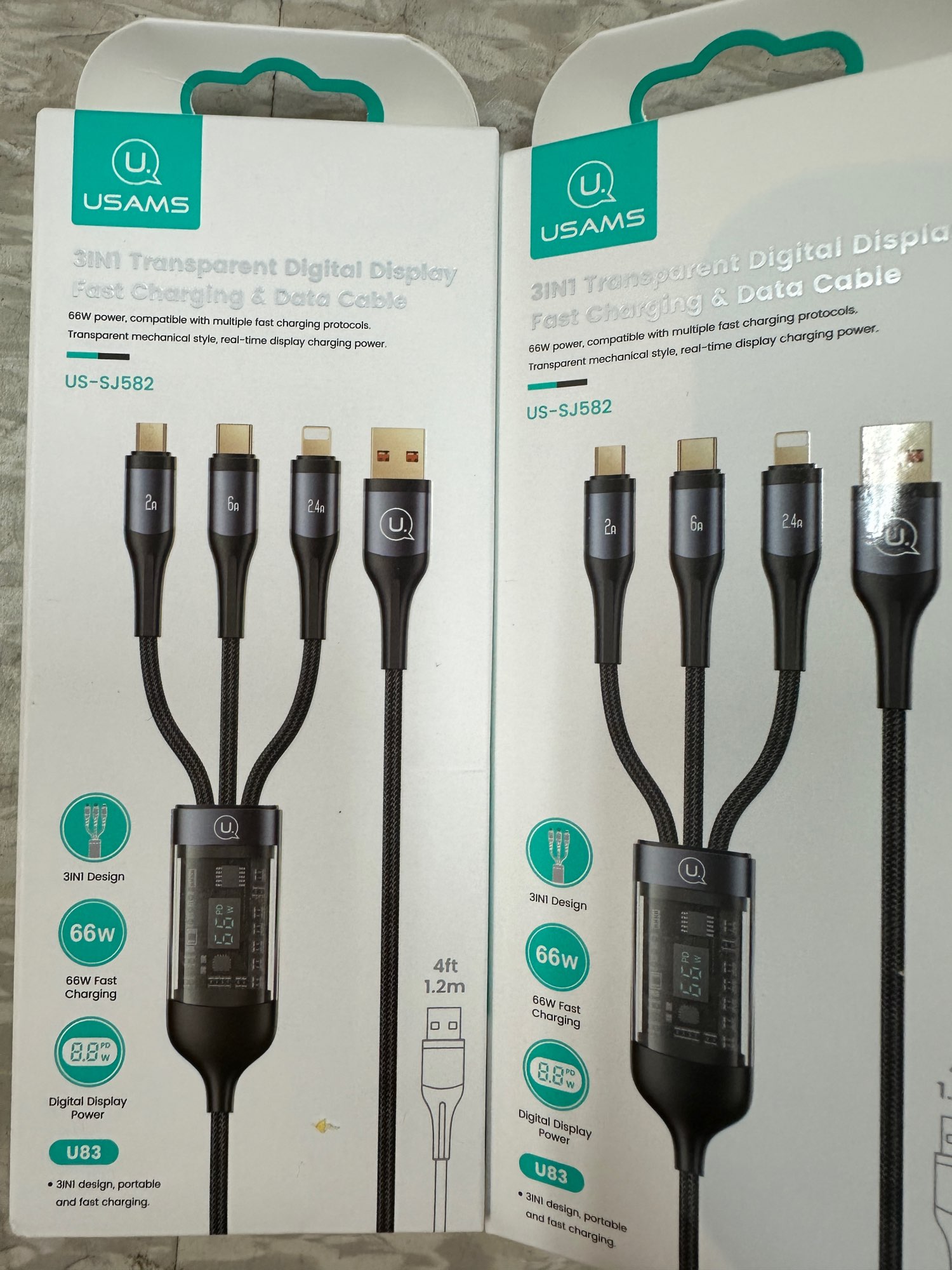 A fantastic 3-way cable with an actual digital charging read-out. There are many fakes out there that make it look as if they are displaying the power level while charging, but don't. This one, however, really does and is far superior in terms of quaiity and robustness. Everything I have bought from USAMS has been of really high quality and works exactly as intended. Buy with confidence.