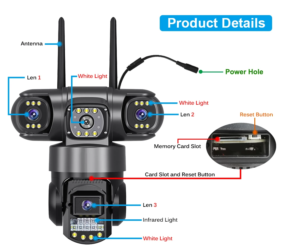 The upper left camera and upper right camera can be adjusted (horizontal 0°-180°) and (vertical 0°-360°) by hands directly, monitor any corner you want.