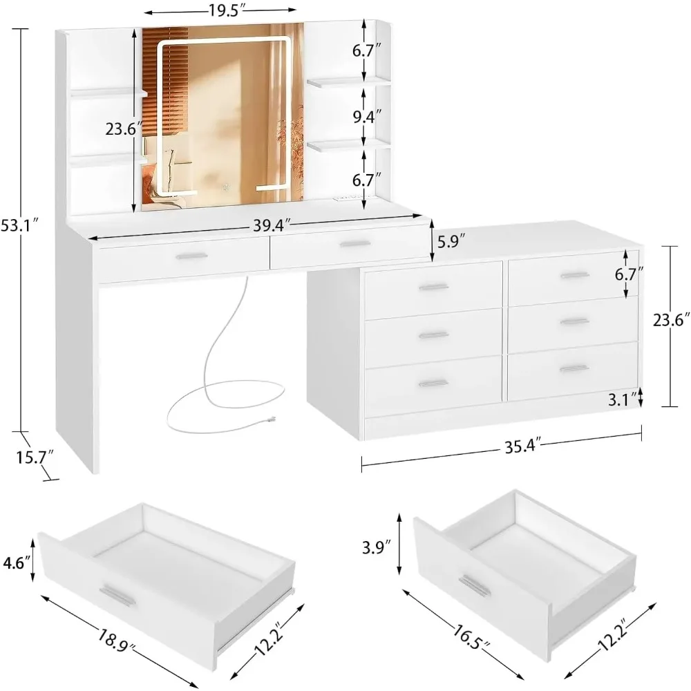 - Built-in Charging Station: The vanity makeup mirror desk has 2 standard plugs and 2 USB ports. Now you can easily power up your hair dryer, curling iron, and other styling tools without any hassle or limitations. Enjoy a perfectly organized beauty routine!