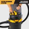 - [USER ACTUATED FILTER CLEANING SYSTEM] The filter cleaning system improves airflow and maintains high level of suction during operation by preventing clogged filters. When the user notices a drop in suction, they follow a few simple steps to clean the filter without having to stop their job or remove the power head and filter.