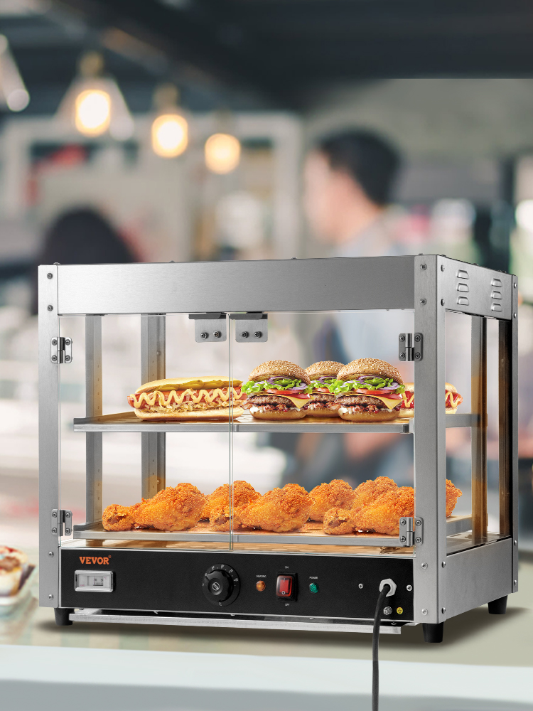 - 2-Tier Commercial Food Warmer: Overall Dimensions: 24″ x15″ x 20″. Our countertop food warmer has 2 spacious layers of interior adjustable food-grade shelves, allowing you to place different sizes of food at will. It is the perfect choice for canteens, bakeries, cafés, fast food restaurants, and convenience stores. Ideal for holding and storing pizzas, tarts, fried chicken, or burgers, ensuring lasting freshness. Taste the difference with every use.