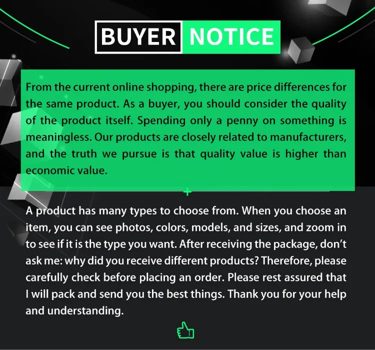 A product has multiple types to choose from. When you choose one, you can see the photo, color, model, and size, and zoom in to see if it is the type you want. After receiving the package, don’t ask me: why did you receive different products? Therefore, please carefully check before placing an order. Please rest assured that we will record and inspect the entire process before packaging and sending it to you