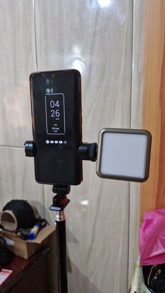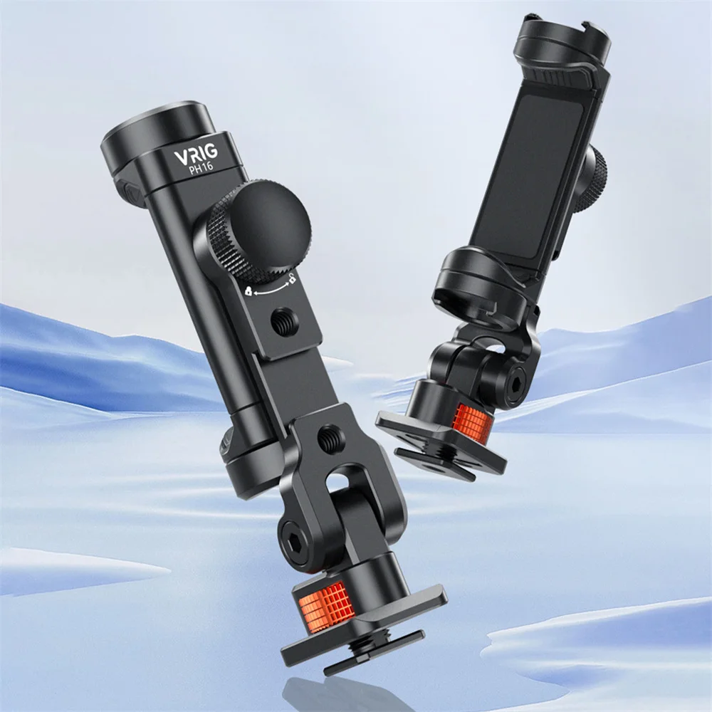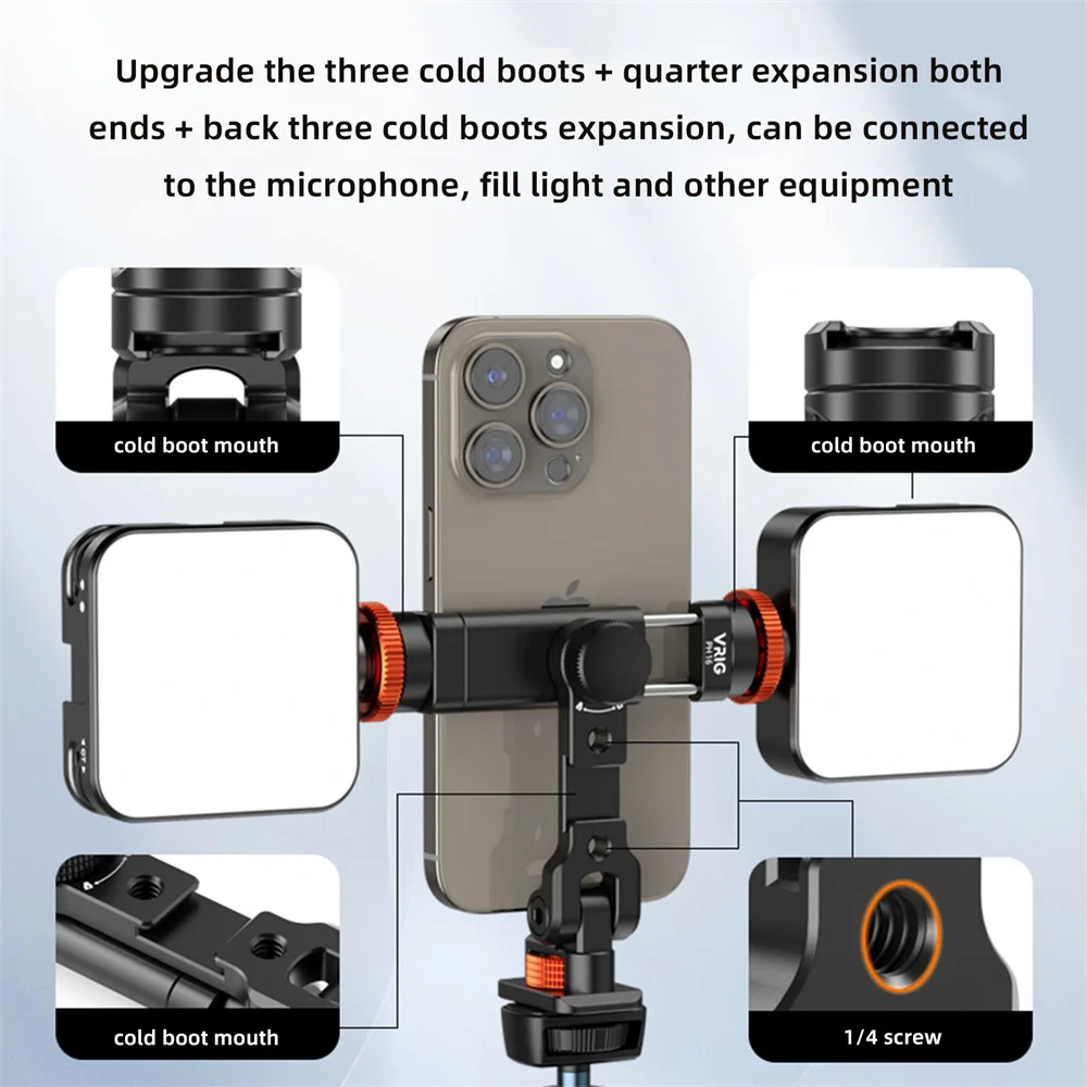The smartphone holder with 2 side cold shoe and 1 back cold shoe, and 2 back 1/4”” screw holes. You can attach additional LED light, microphone or other devices