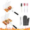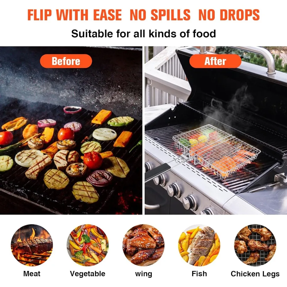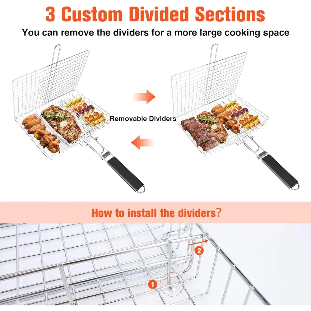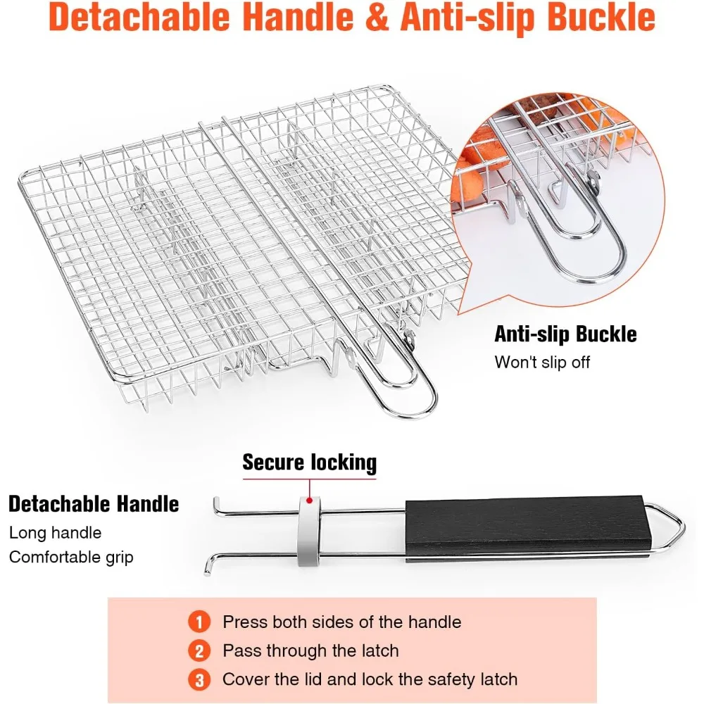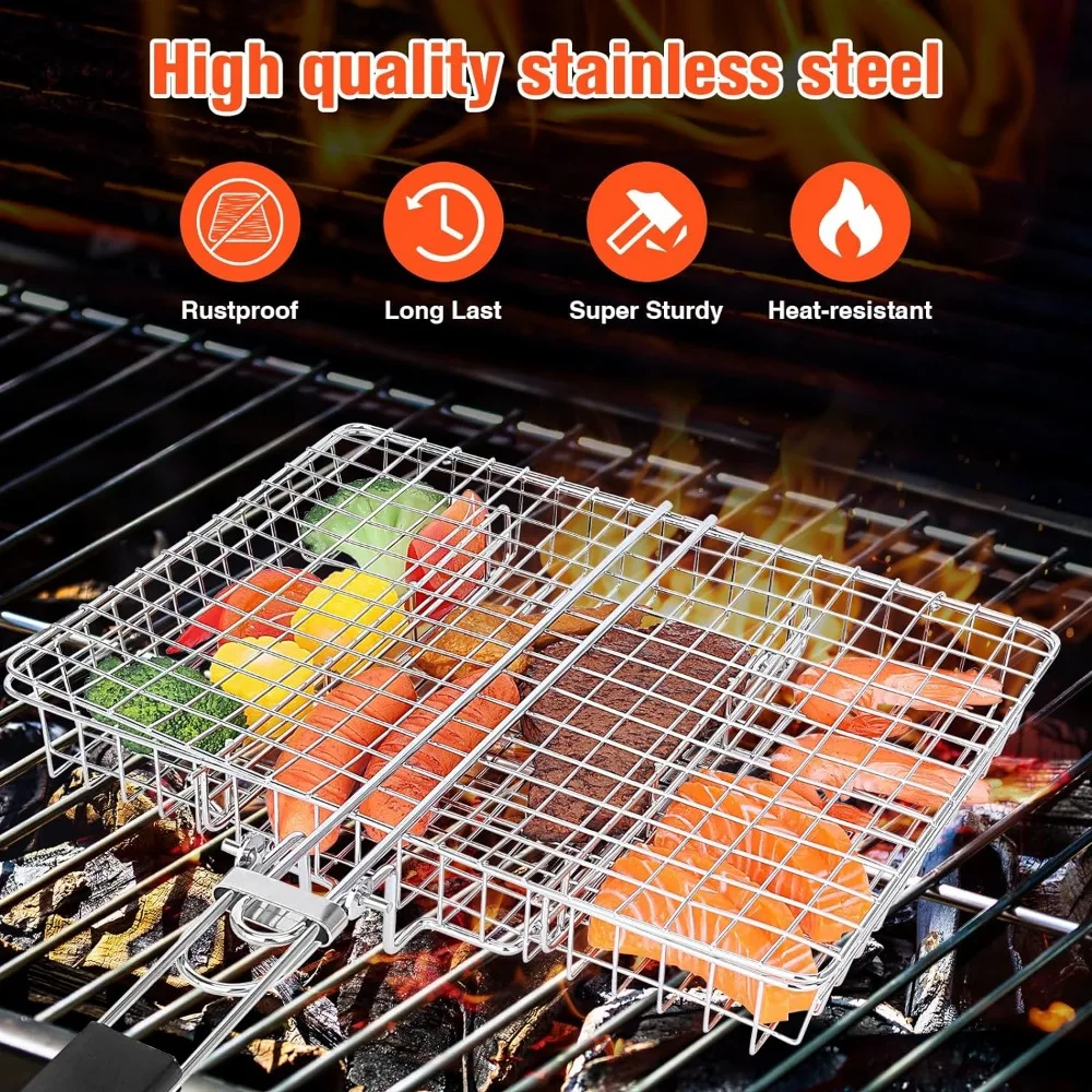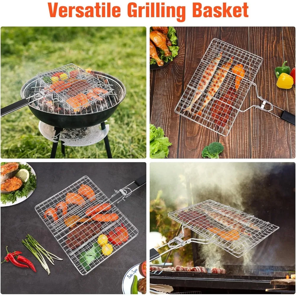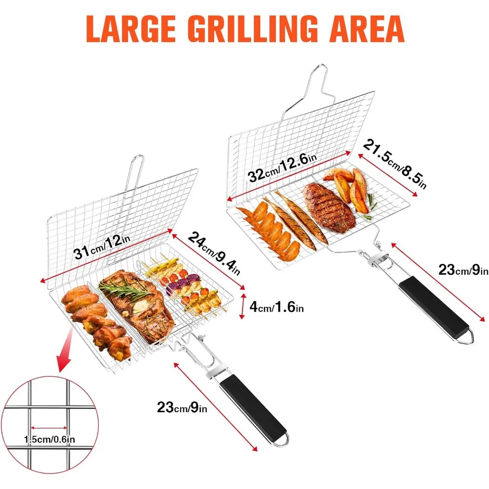 WADEO 2PCS Stainless Steel Foldable BBQ Basket, Foldable Grill Rack With Handle, Portable Grilling Basket, Grill Basket for Fish
