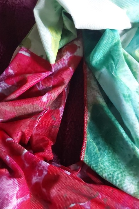 Mesh see through fabric but the print is cute. Can’t wait to wear it.