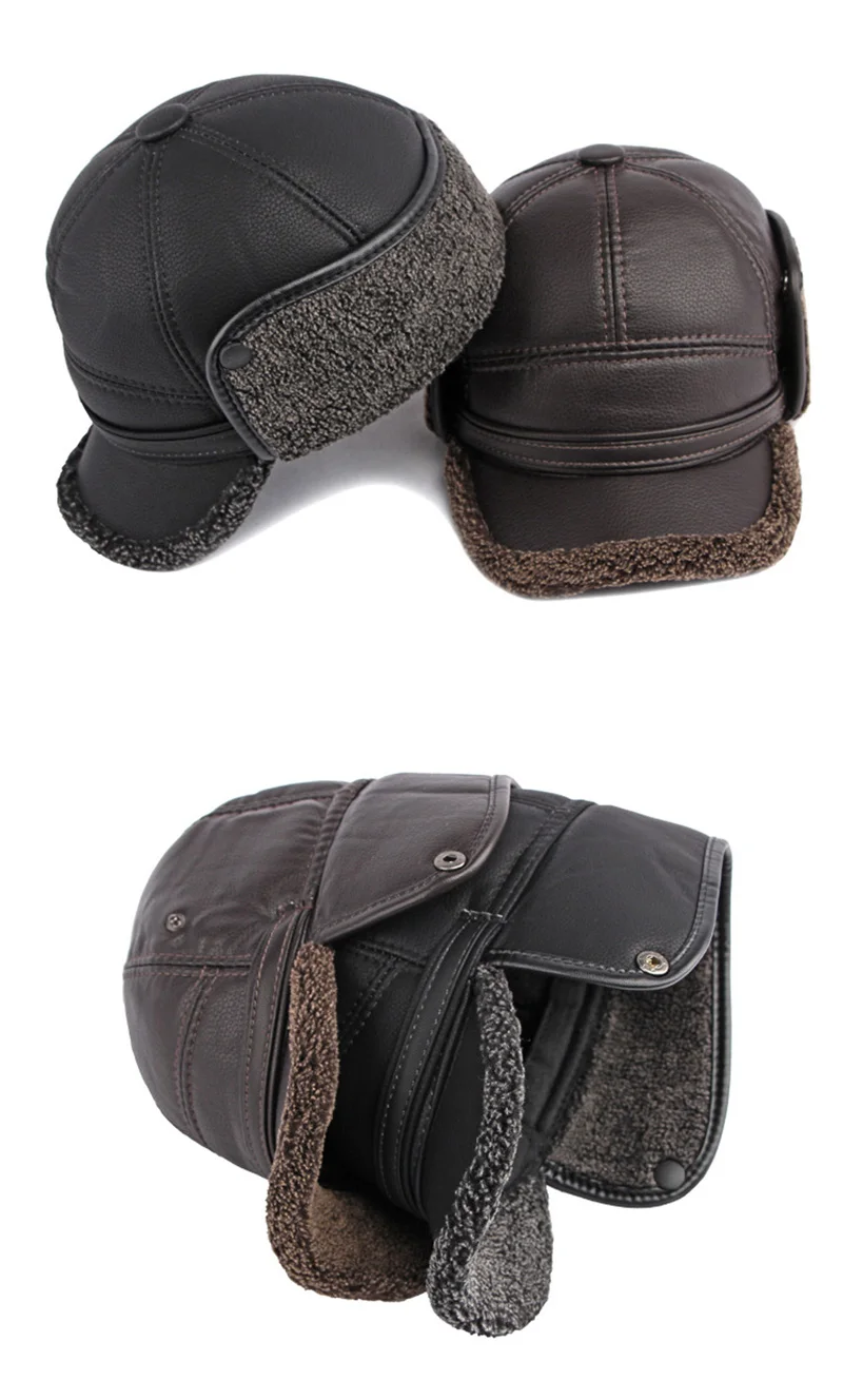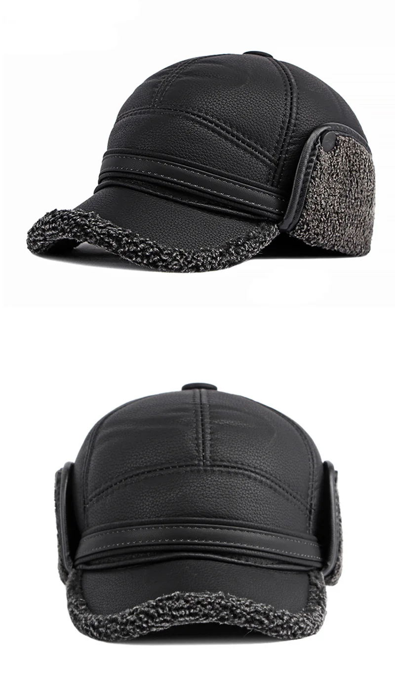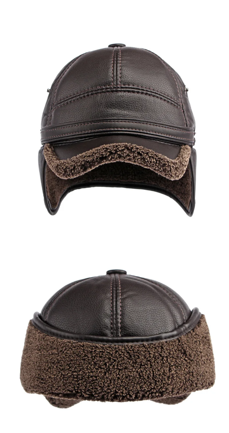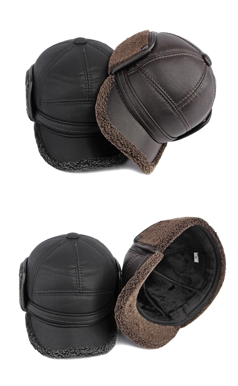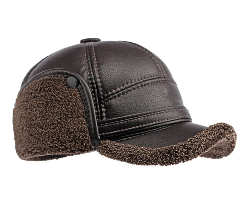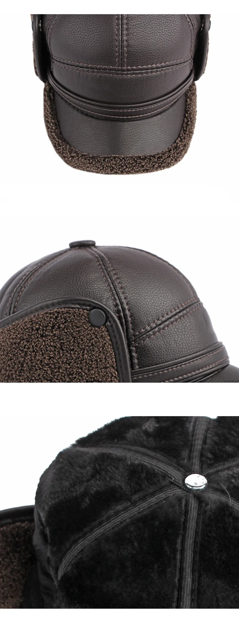 Winter Baseball Cap Men PU Leather Bomber Caps Middle Elderly Dad Hat With Earflaps Thicker Warm Windproof Russian Trapper Hat