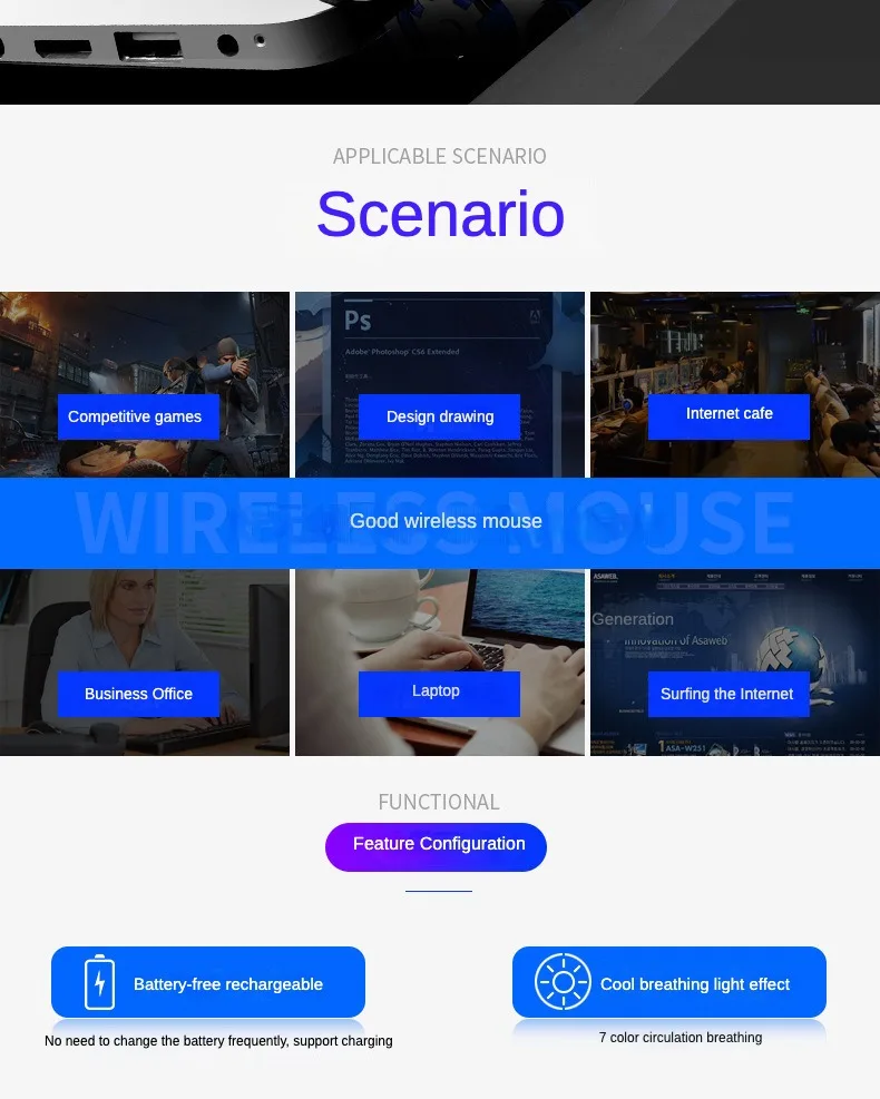 【LED 7-Color Breathing Backlit】Designed 7-color auto-switching breathing backlight mode, the wireless mouse can offer you a pretty cool visual feast when using it, especially at night. The LED lights will auto turn off at sleep mode for power saving.