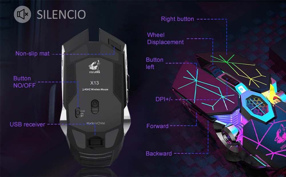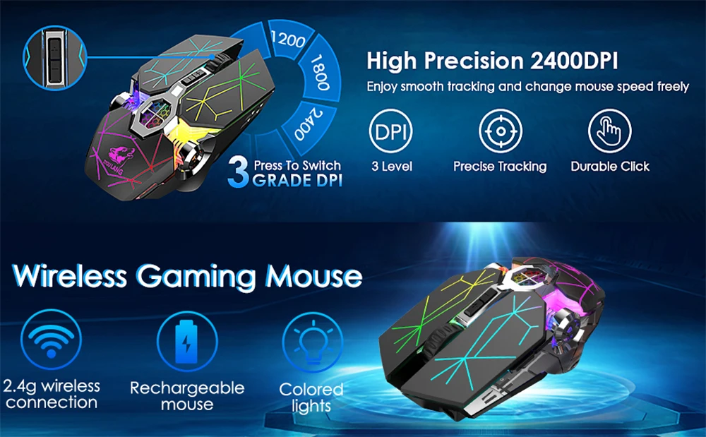 2.4GHz wireless mouse, ultra-long-distance transmission up to 10 meters and stable wireless transmission. 1200/1800/2400 CPI can be switched freely, high precision can meet your needs.