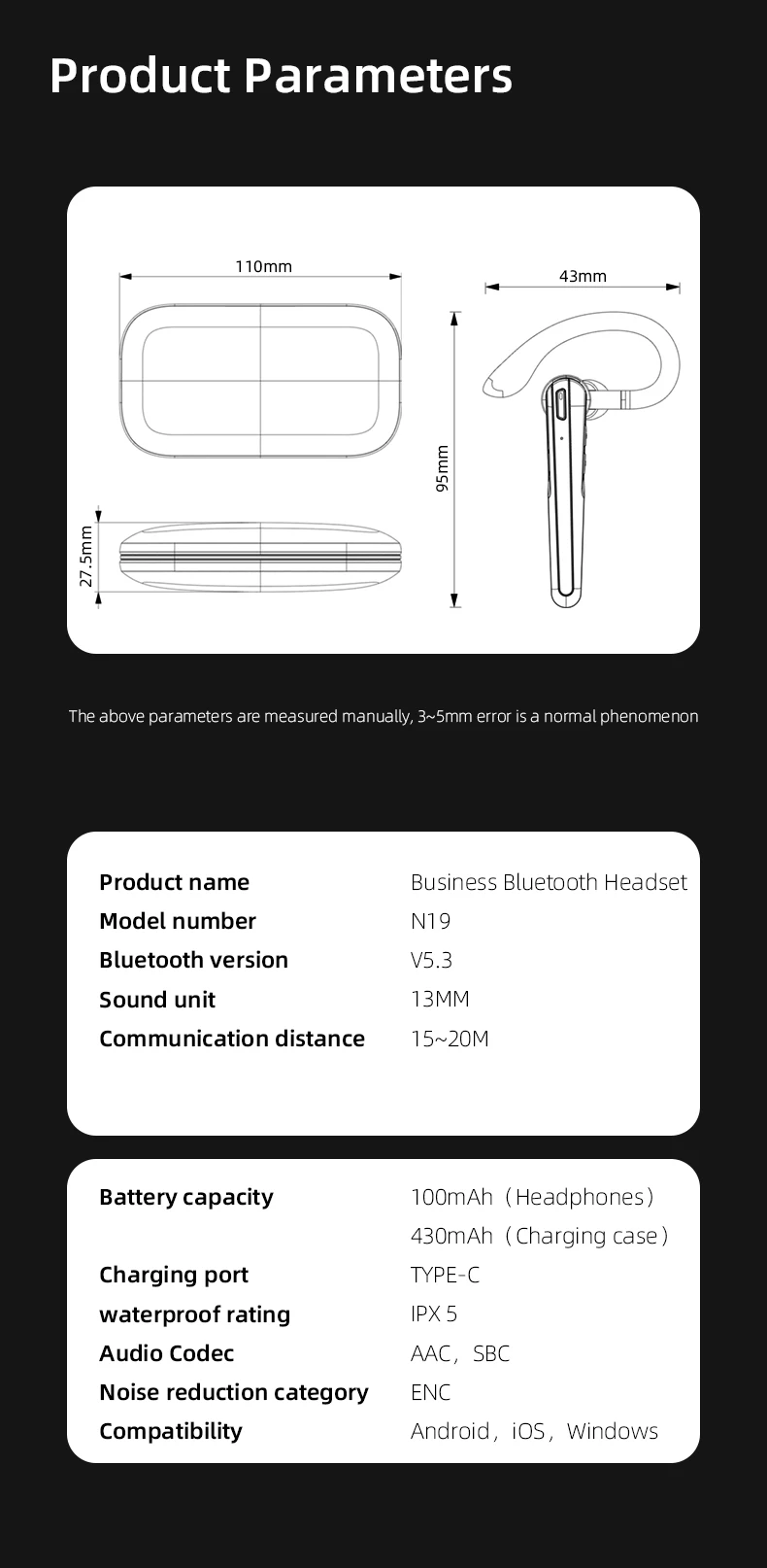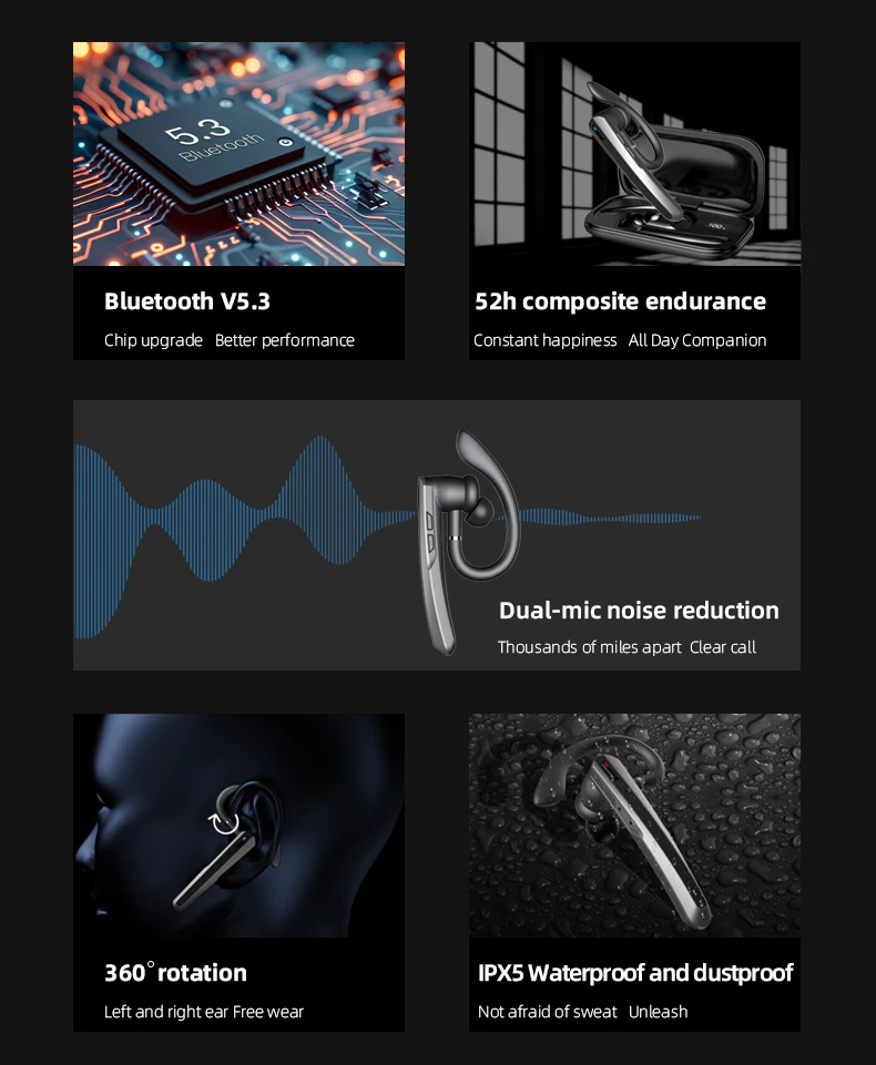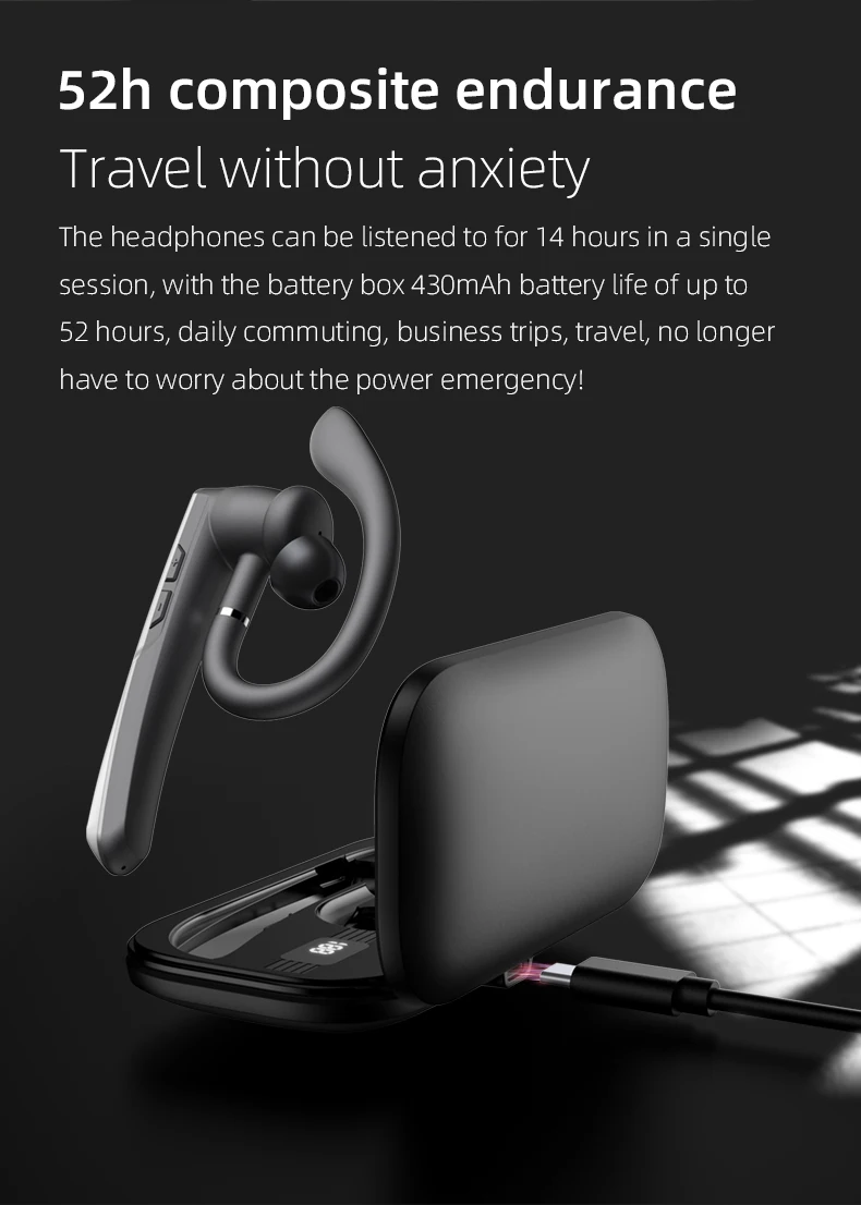 Long Lasting Battery Life:The wireless headset with microphone only 1-1.5H FAST Charging time, Portable charging box can charge Bluetooth Earbuds 4 times. Bluetooth earpiece can be charged with charging box or TYPE-C charge cable(included) for your preference.