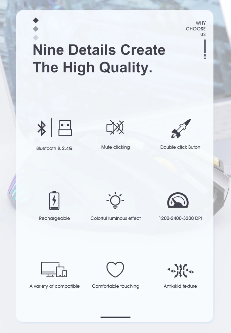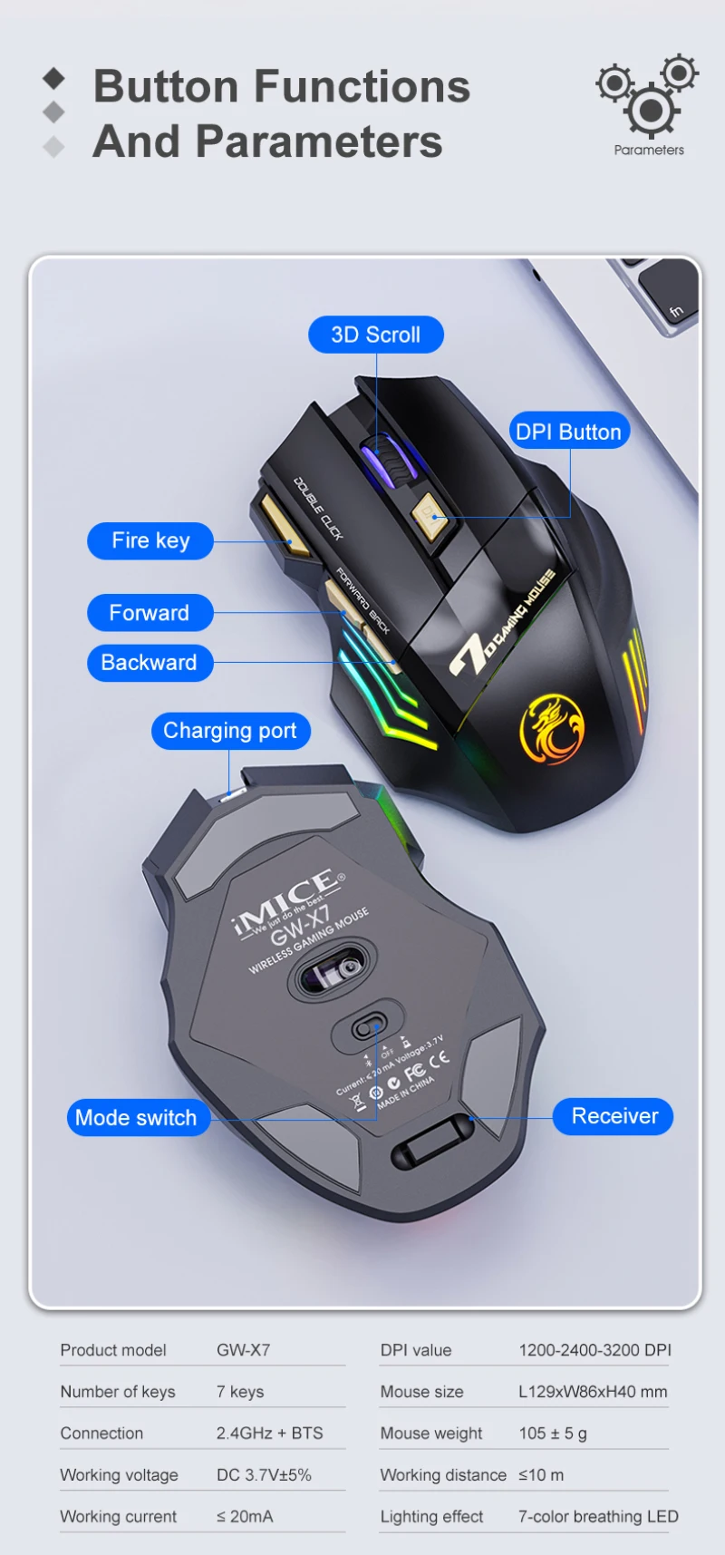 Wireless Mouse Rechargeable colorful breathing light Computer Gaming Mouse button double click free 2.4G Silent Mice Mouse