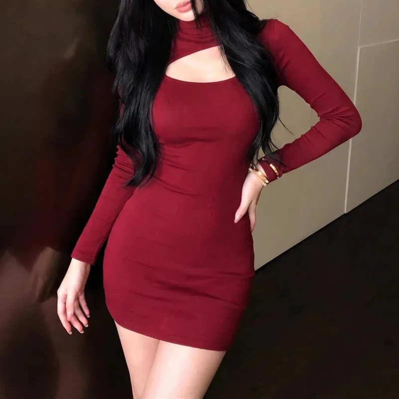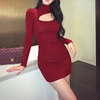 Women Sexy Hollow-out Backless Dresses Bodycon Slim Turtleneck Black Party Night Mini Dress Long Sleeves Club Clothing