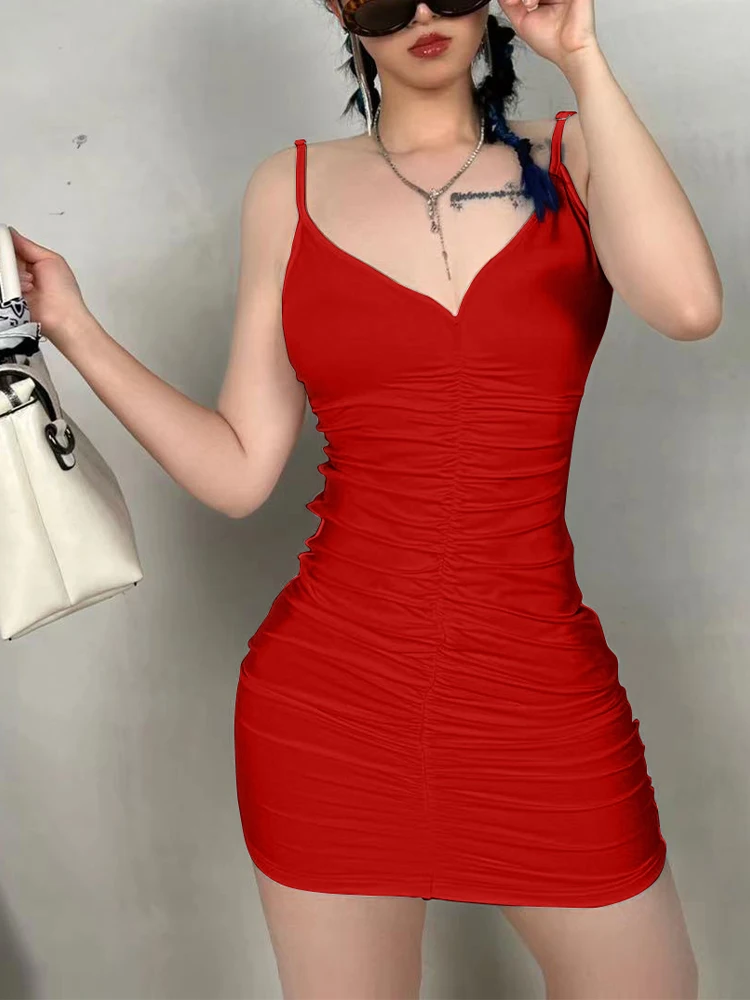 Women’s Suspender Dress with Pleatch Detail V-Neck Backless Sexy Mini Dress for Club Party Red Short Dress