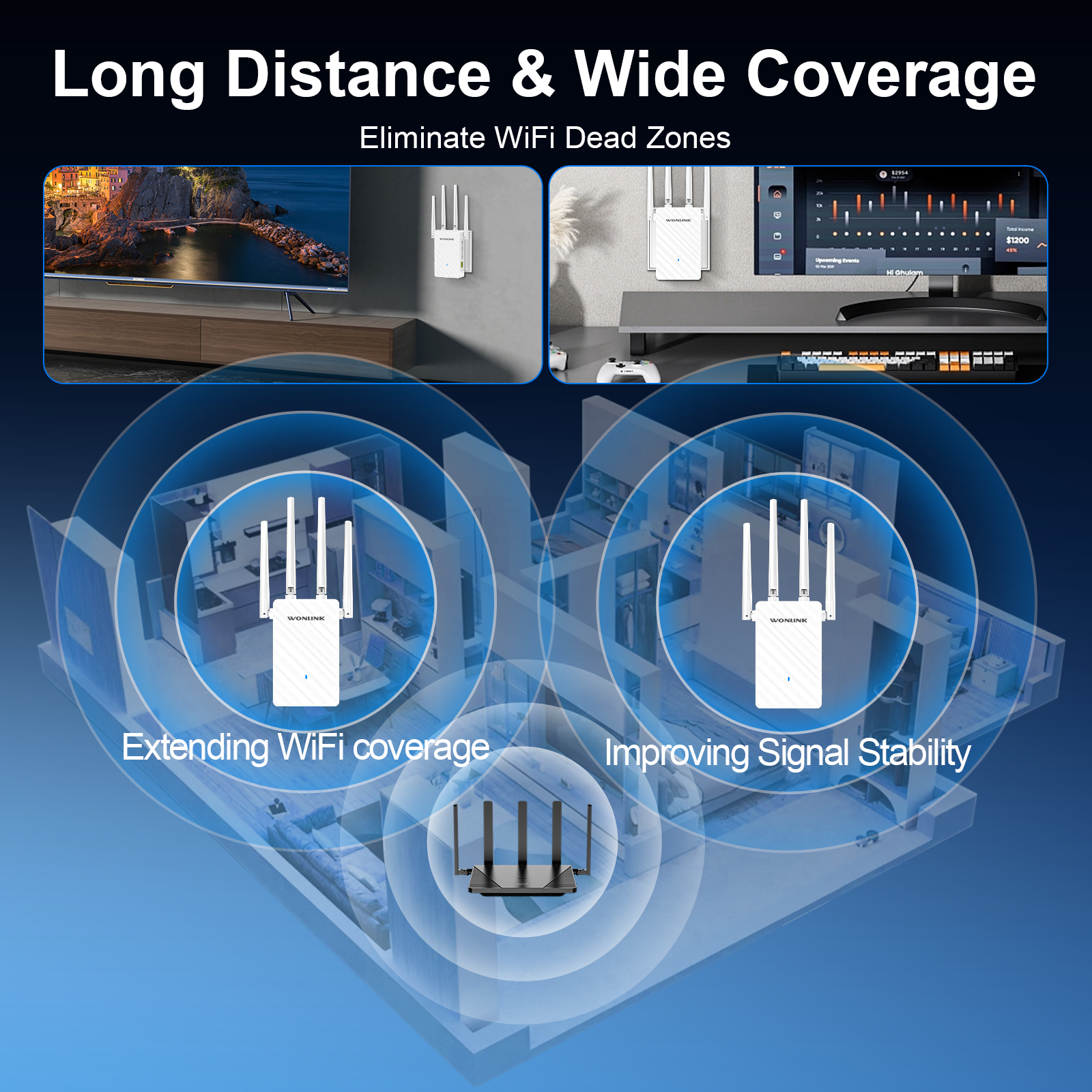 1.Wi-Fi expansion, eliminating dead spots of wireless signals;