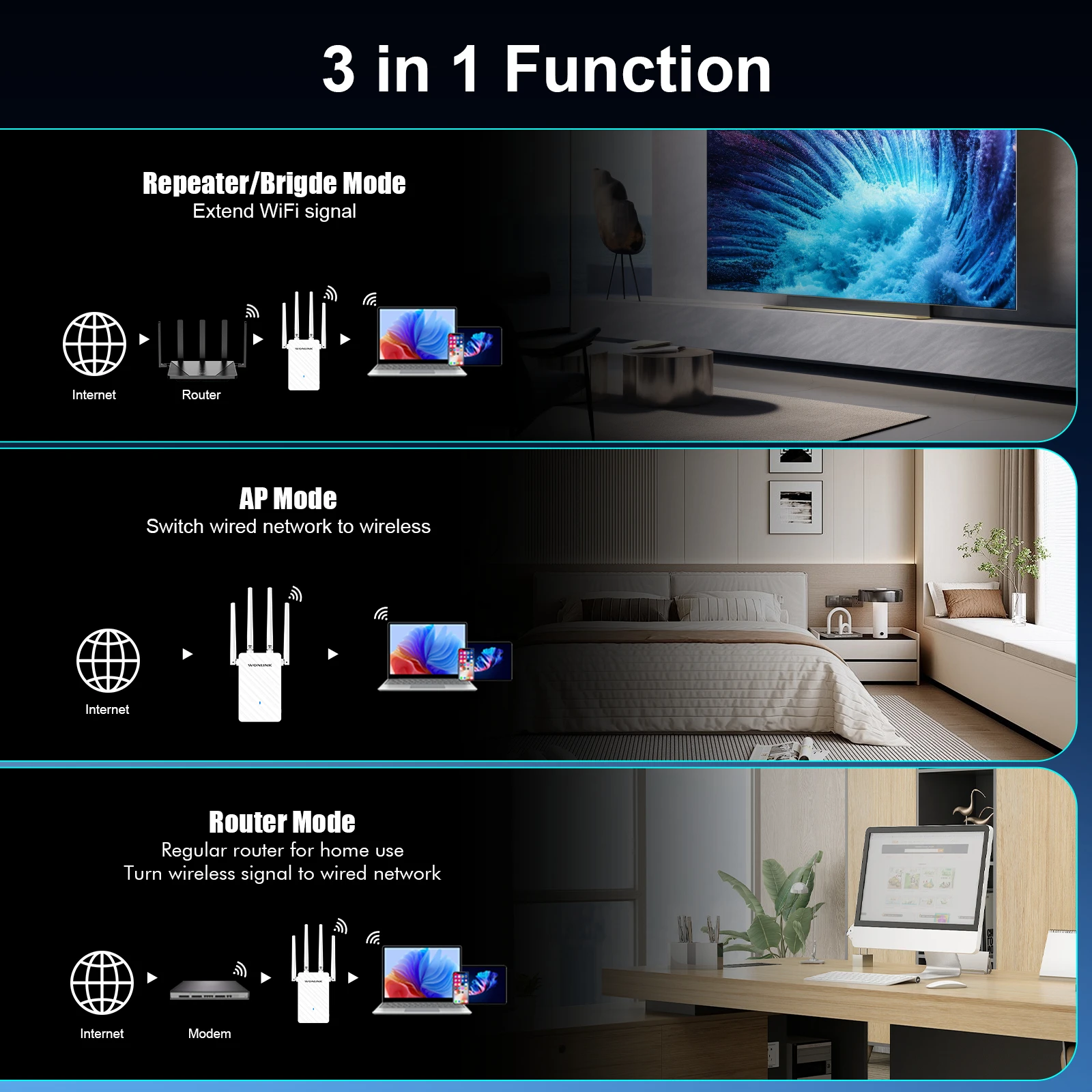 1.Wi-Fi expansion, eliminating dead spots of wireless signals;