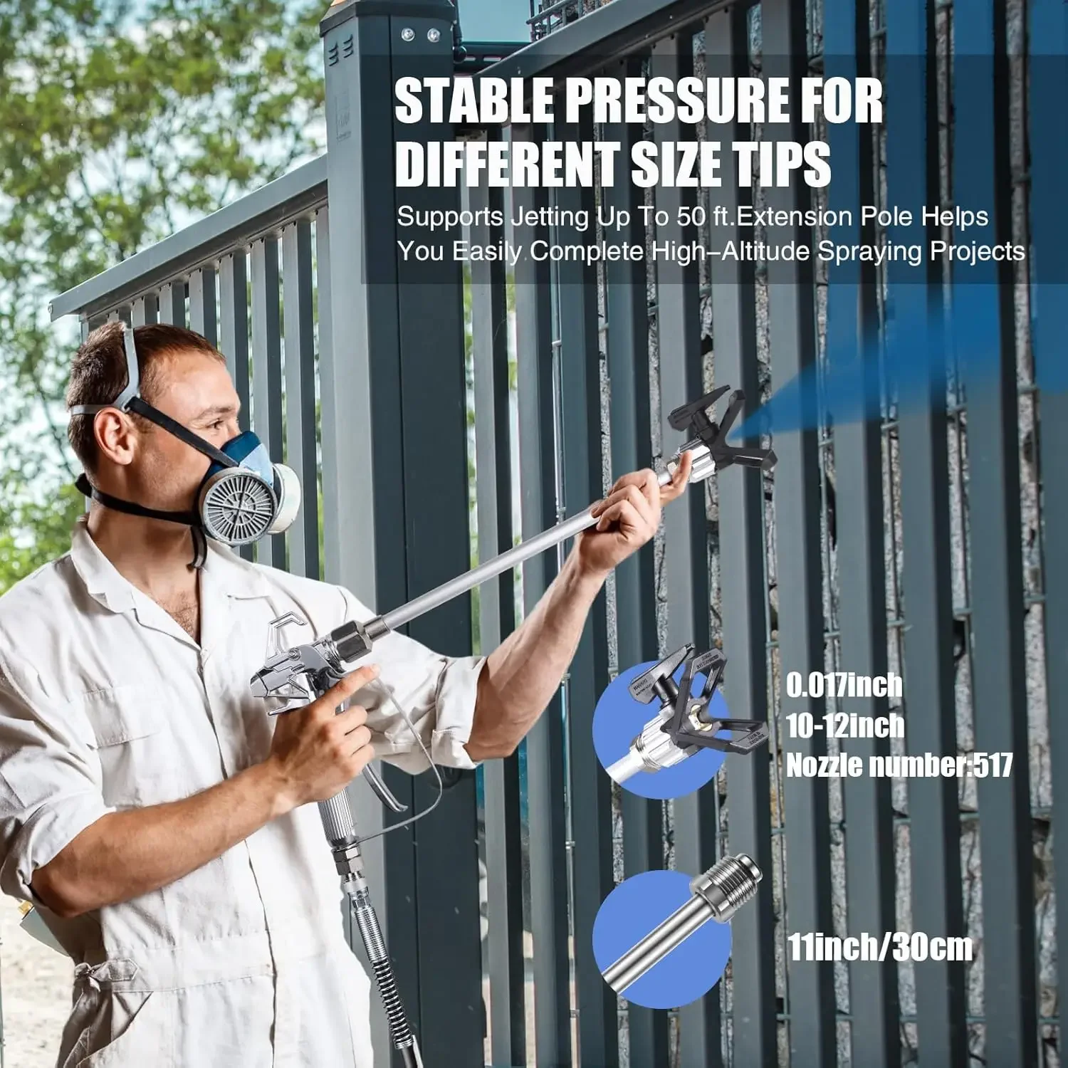Wide Application: The economical airless paint sprayer is ideal for spraying door, trim, interior walls, ceilings, fences, cabinets, sheds, decks, garage and many other places indoors and outdoors. the 517 tip and 30cm/11.8inch extension pole allows you to easily complete spraying projects of various heights without the need for ladders or scaffolding. The recommended annual usage of 200 gal can meet your needs for a variety of spraying projects.