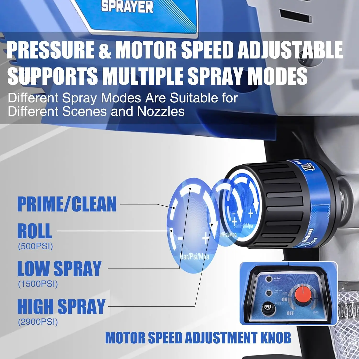- Adjustable Pressure & Motor Speed: Our 650W airless paint sprayer flow rate is 0.39GPM (1.5L/min) and the pressure can reach up to 3000psi. You can achieve different spraying effects by adjusting the pressure and motor speed to meet your different spraying needs. Fully adjustable pressure and motor speed control will give you a good spraying experience.