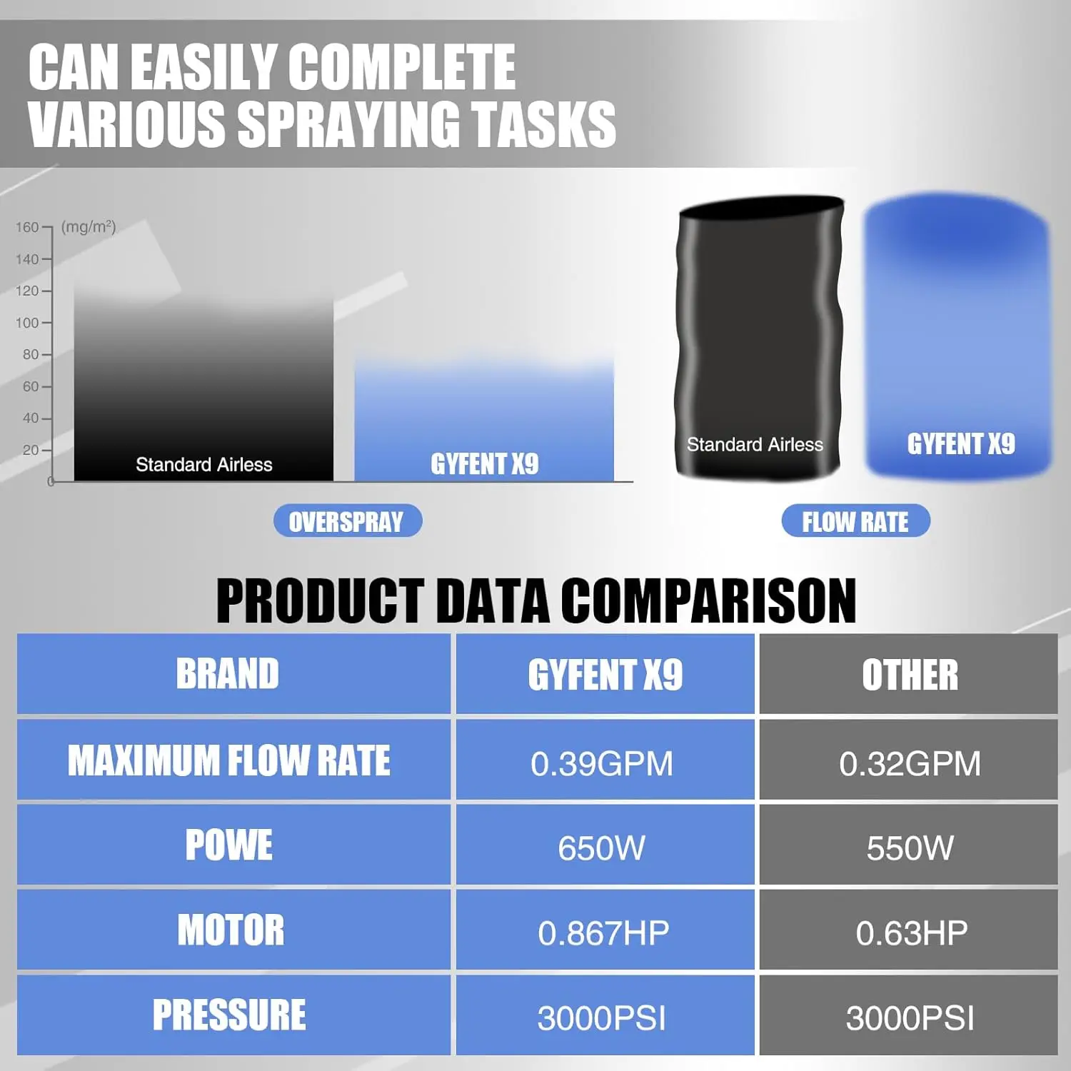 - X9 Airless Paint Sprayer:Compared with ordinary rollers or brushes, our airless paint sprayer has higher spraying efficiency and soft spraying effect, which can make the paint spray evenly on the surface of the object. It can not only greatly improve your spraying efficiency, can also make your spraying patterns more beautiful. At the same time, our airless paint sprayer can reduce overspray by up to 55%, making cleanup easier and saving you some paint costs.