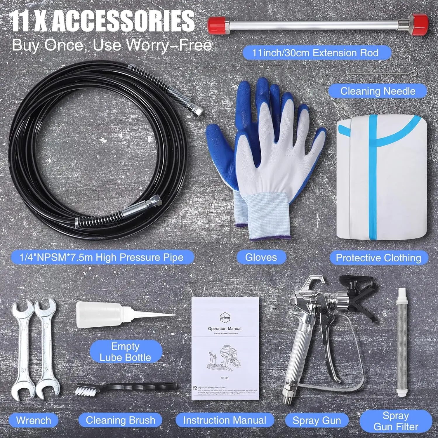 - Package Includes: You will receive an airless paint sprayer, 1 pcs spray gun, 1 pcs 7.5m high pressure pipe, 1 pcs 30cm extension rod, 1 pcs empty lube bottle, 1 pcs cleaning brush, 1 pcs cleaning needle, 2 pcs wrenches, 1 pcs protective suit, 1 pcs spray gun filter, 1 pair of gloves and 1 pcs instruction. With just one purchase you have all the accessories you need to paint and start enjoying your painting time!