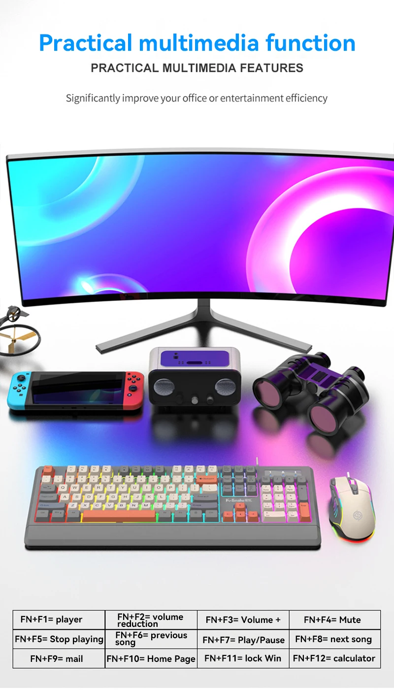 –Customizable Function Keys: Tailor your keyboard to your preferences with programmable function keys. Assign macros, shortcuts, and custom commands to enhance your efficiency and gaming strategy.