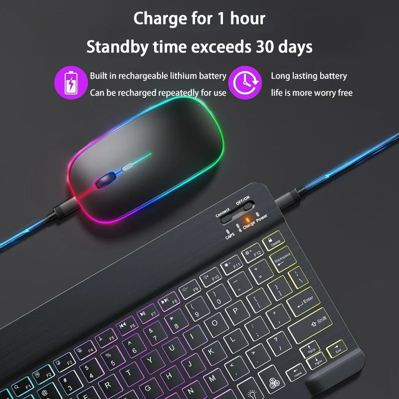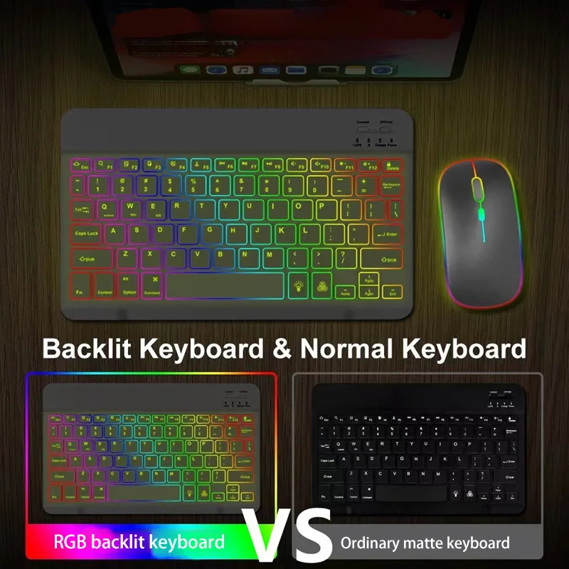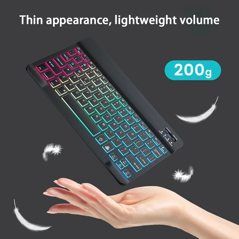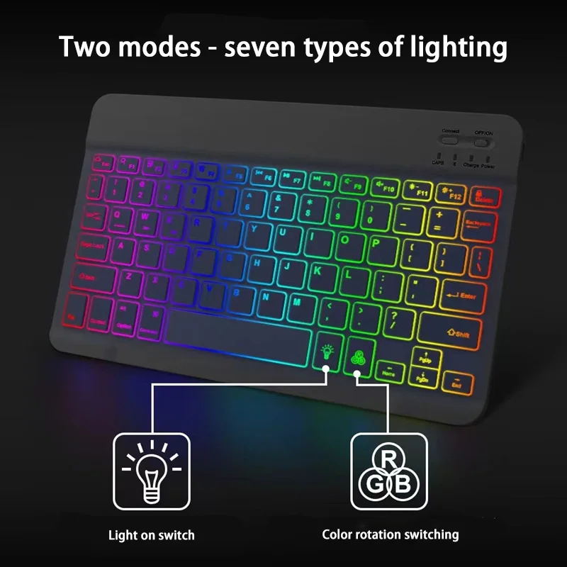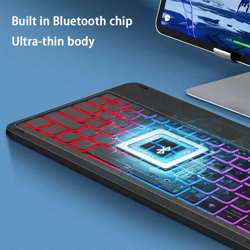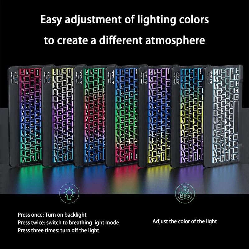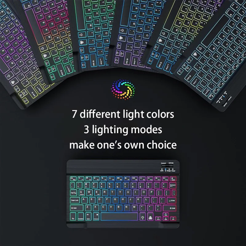 (1)7-Color Backlit Bluetooth Keyboard – This backlit bluetooth keyboard has 7 switchable backlight colors, It helps you to type easily in the absence of light. The bluetooth keyboard adopts a scissors switch design, which allows you to have a comfortable and quiet typing experience and enhance your work or entertainment experience and fun.