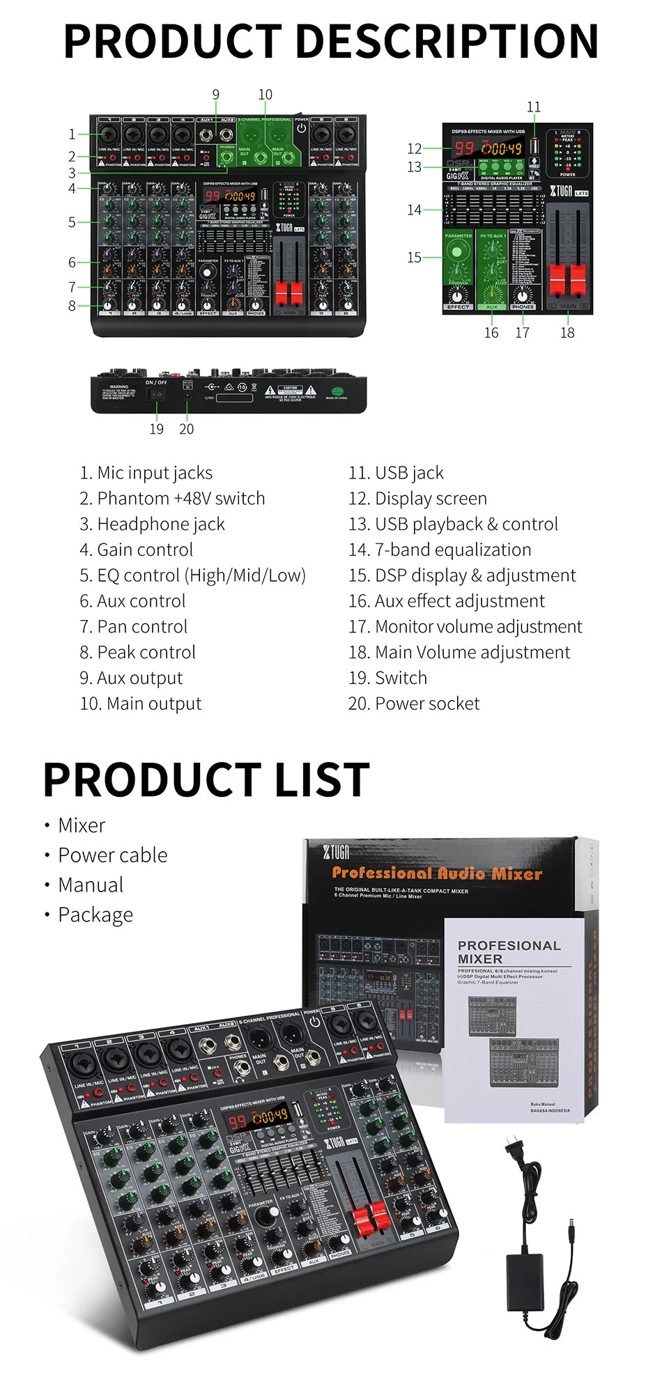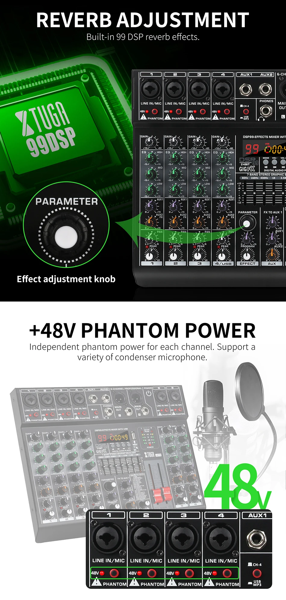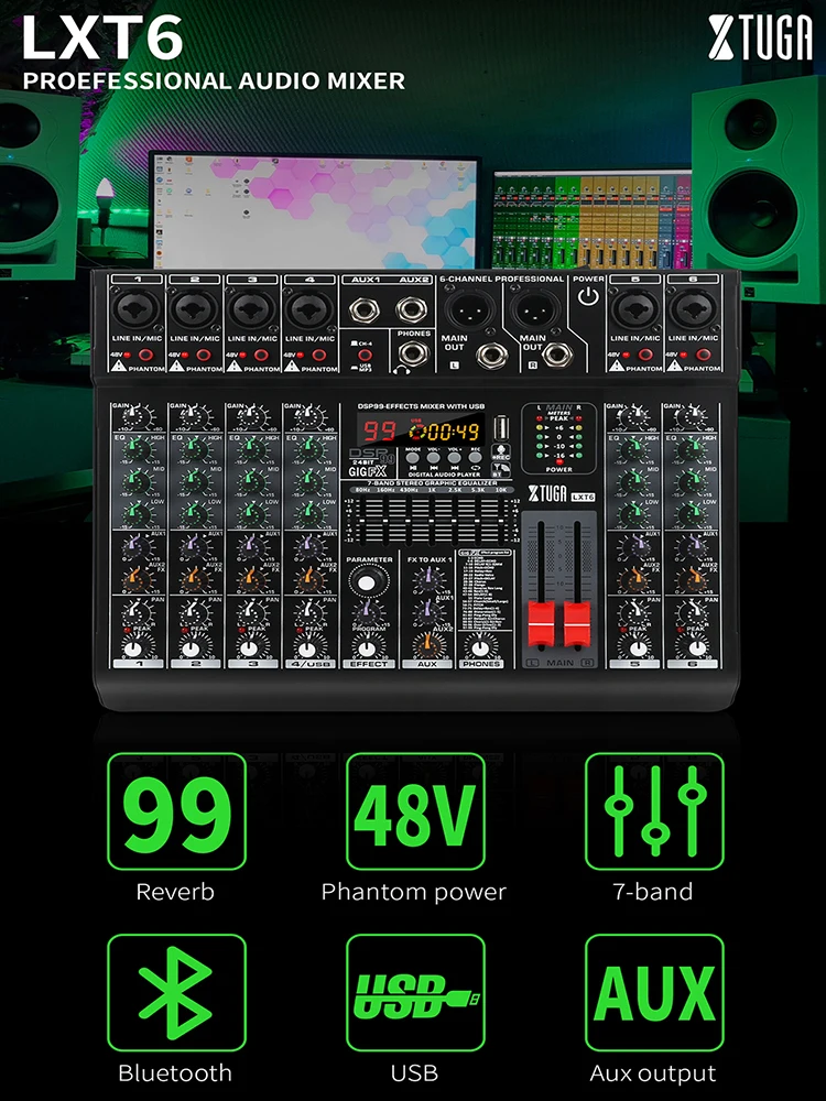 XTUGA Professional 6 Channel Mixer Digital Audio Mixing Console