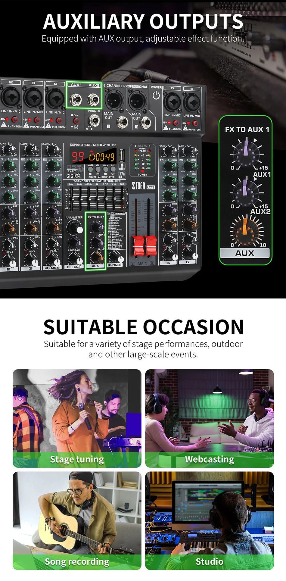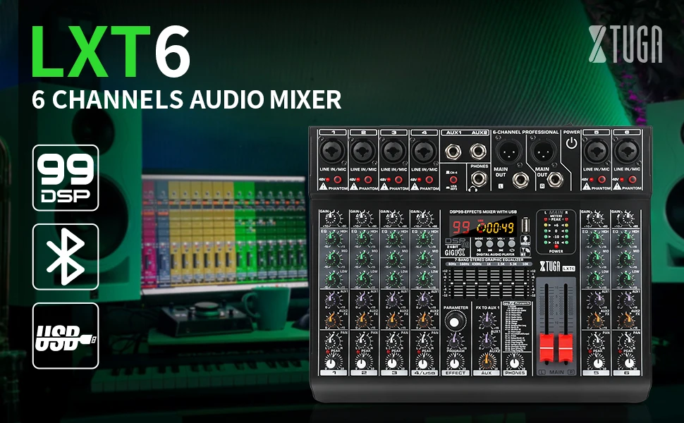 XTUGA LXT6 professional audio mixer system is a truly user-friendly, yet pleasantly sounded, 6-channel sound table. The LXT6 is configured with all the essential mixer features. The capability of letting user connect a computer to the USB interface, the LXT6 allows the user to coordinate this audio mixer with a computer to record and/or to perform the music replaying applications.