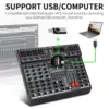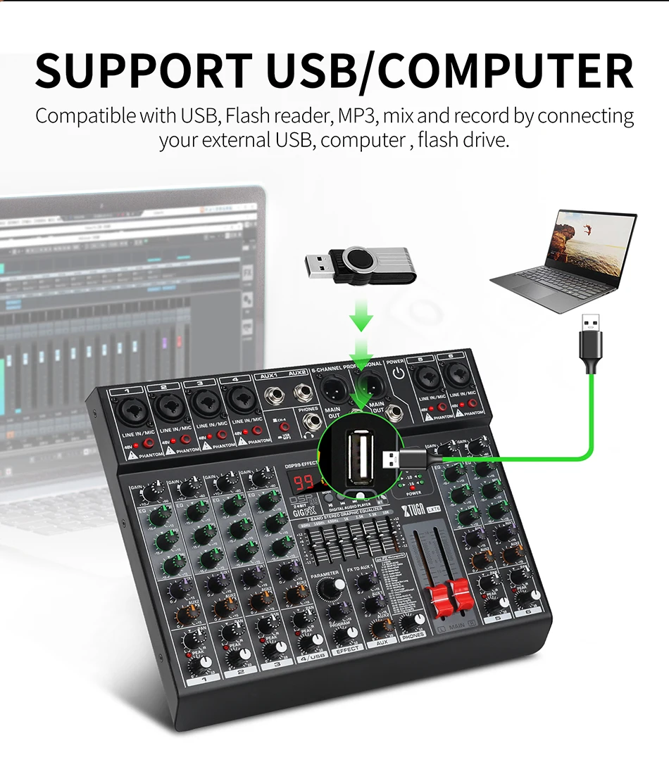 1. 6 channels audio mixer with USB interface to computer for recording and music playing applications.