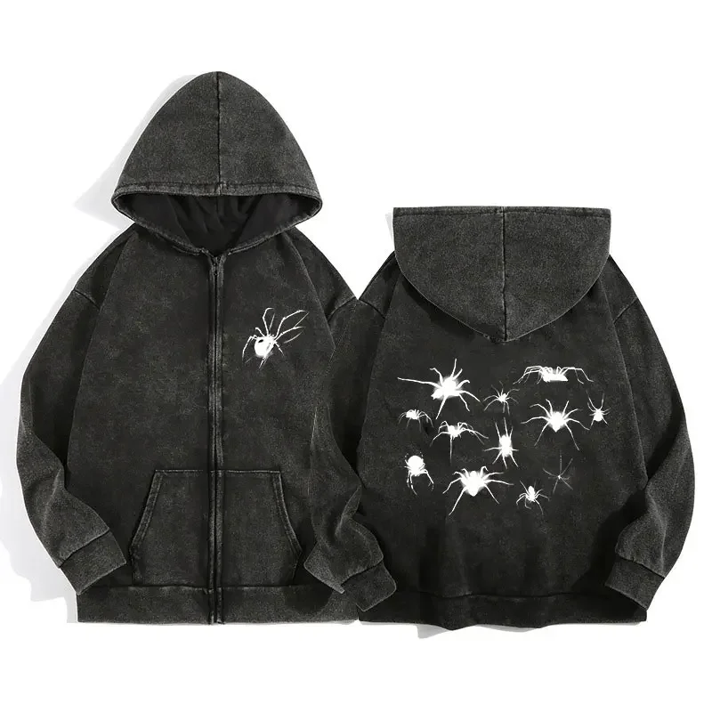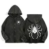 Y2K Acid Wash Zip Up Hoodie Harajuku Retro Gothic Graphic Spider Print Jacket Sweatshirt High Quality Cotton Men Women Clothing