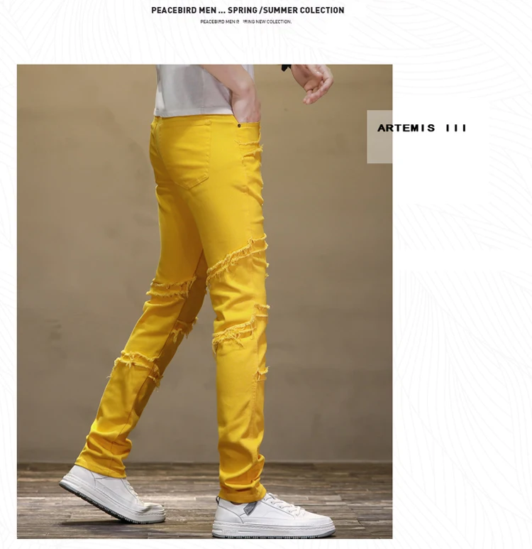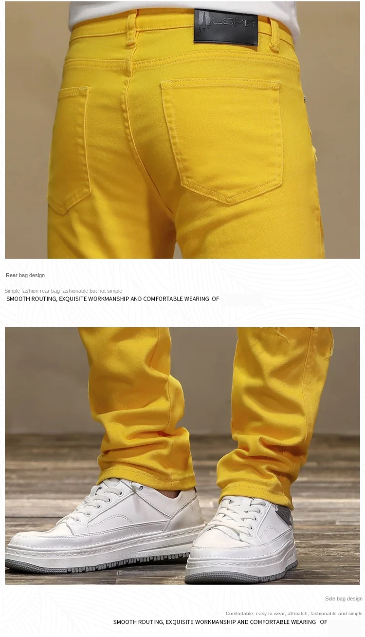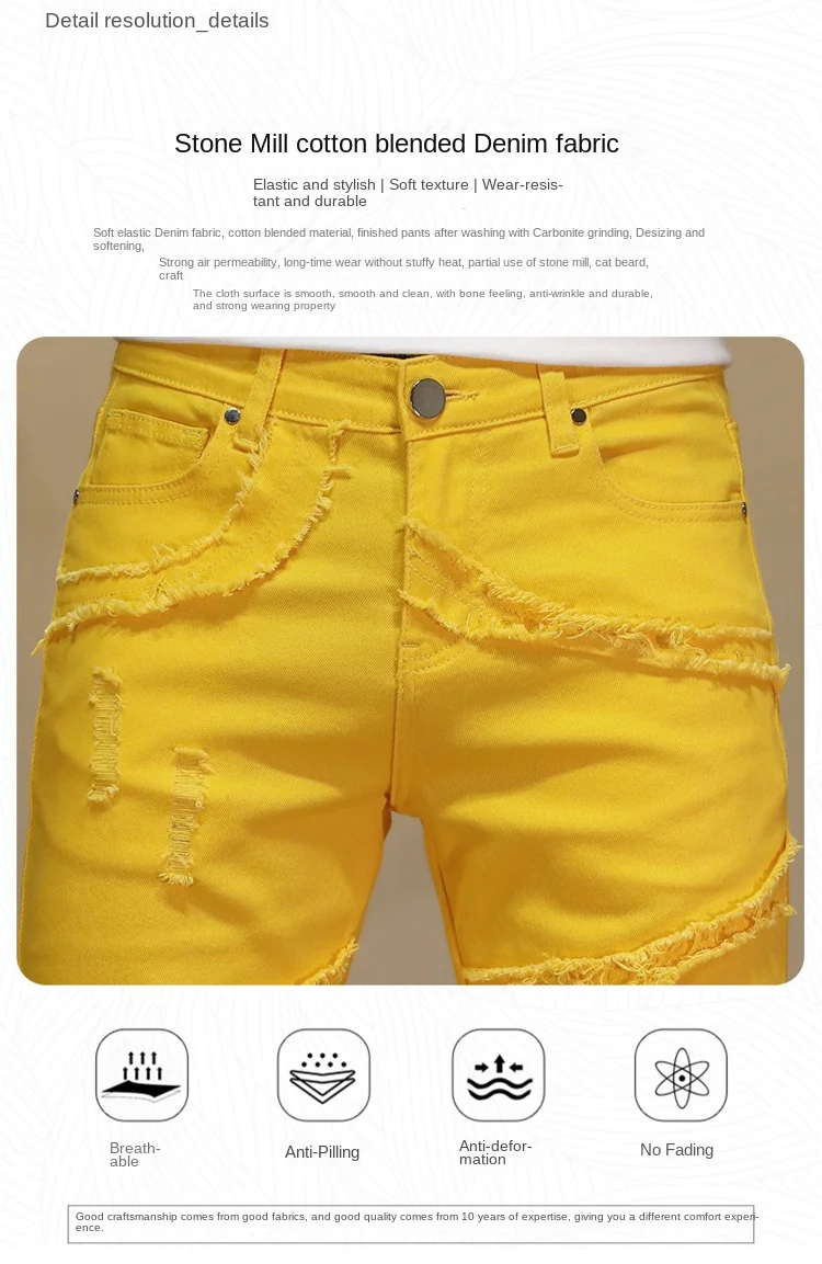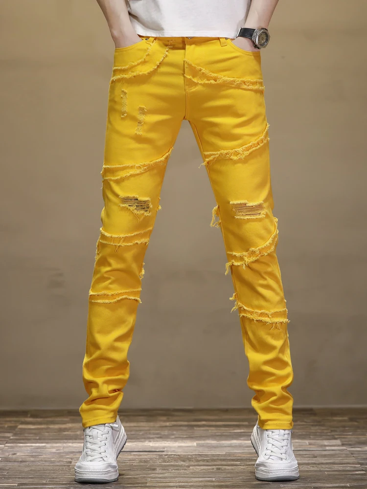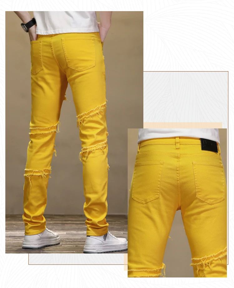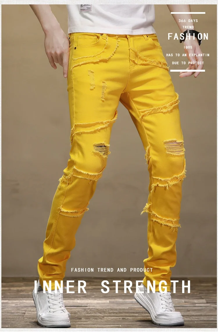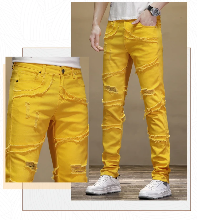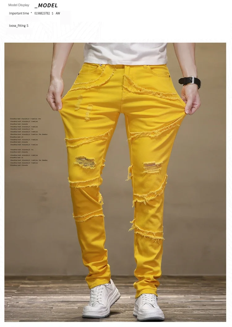 Yellow Motorcycle Jeans Men2024New Style Frayed Stitching Ripped Personality Casual Stretch Slim Fit Skinny Long Pants