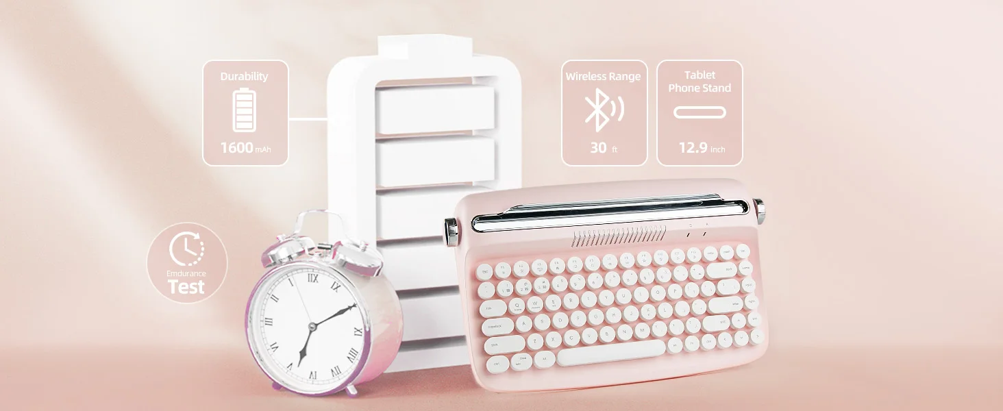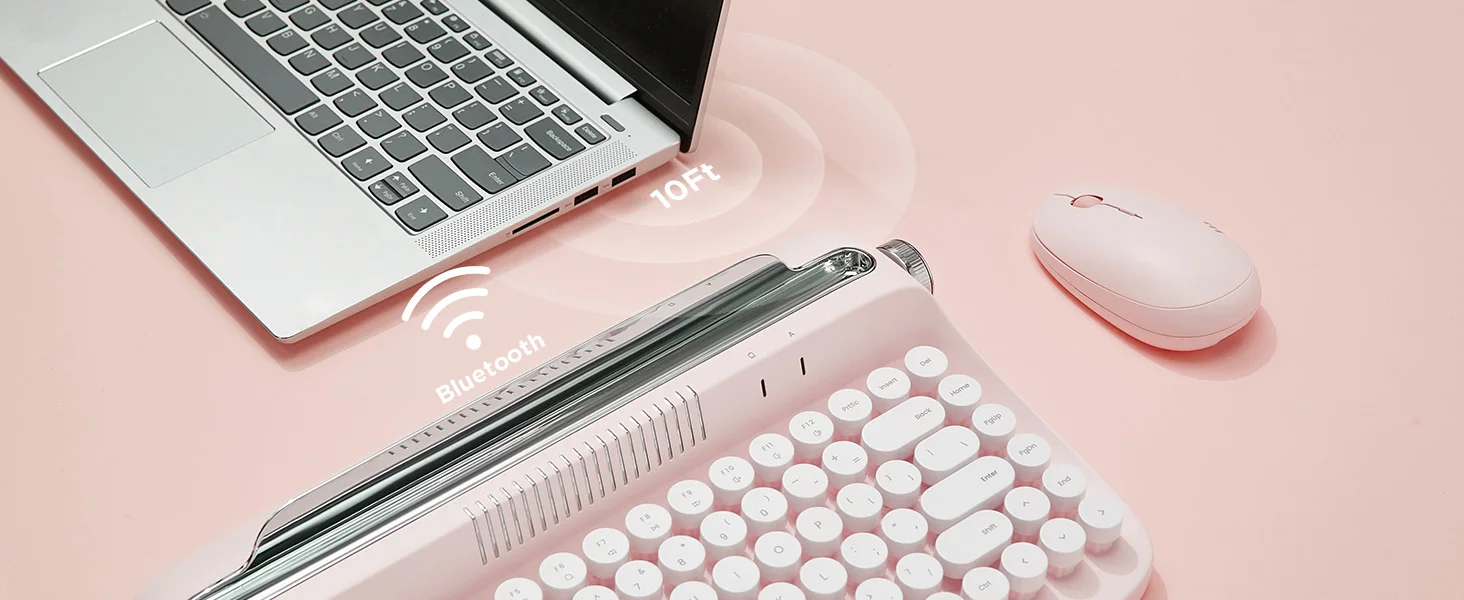 The B303 typewriter Bluetooth keyboard features the latest Bluetooth 5.0 technology, providing a stable and cable-free connection with a range of up to 33 feet (10 meters) without any delays. You can easily switch between up to three devices with the touch of a button, FN+1/2/3.
